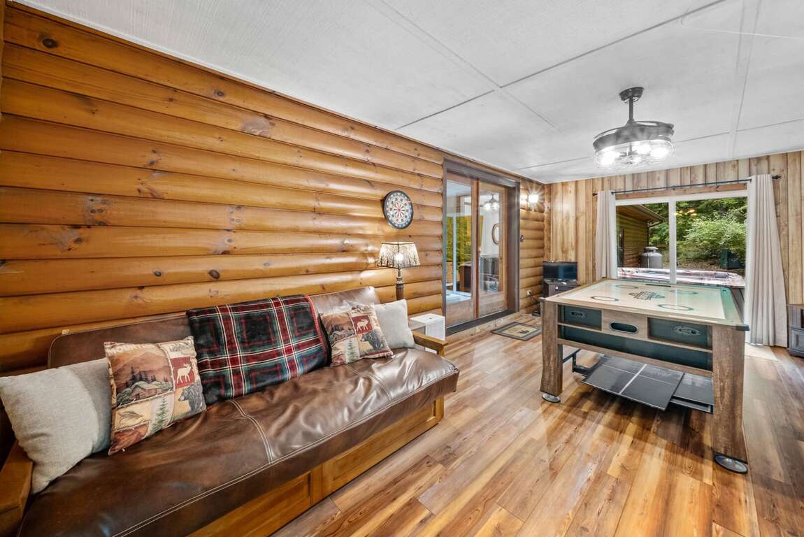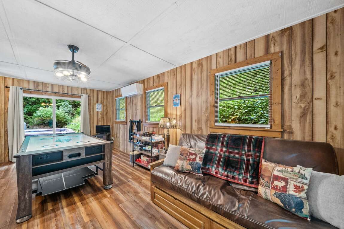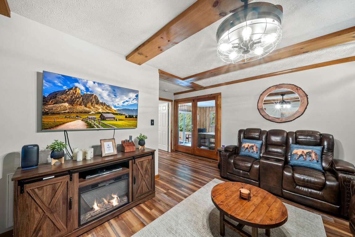 Step inside to a spacious living room featuring multiple leather recliners, a big-screen TV, and an electric fireplace—the ideal spot for cozy evenings. The game room is a favorite hangout, complete with a TV, electric fireplace and a convertible game table that switches from air hockey to pool. A well-equipped kitchen, gas grill, and outdoor dining area make it easy to gather for meals.