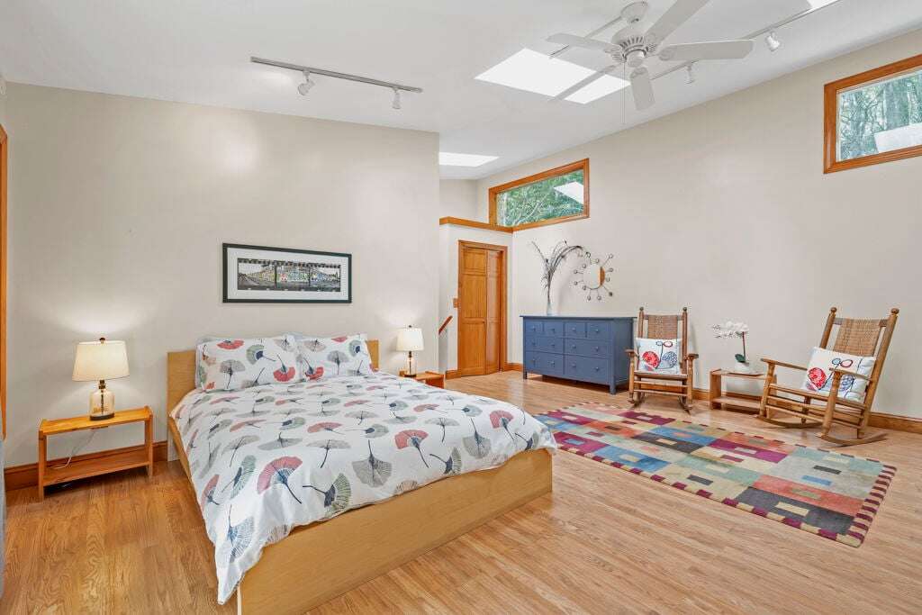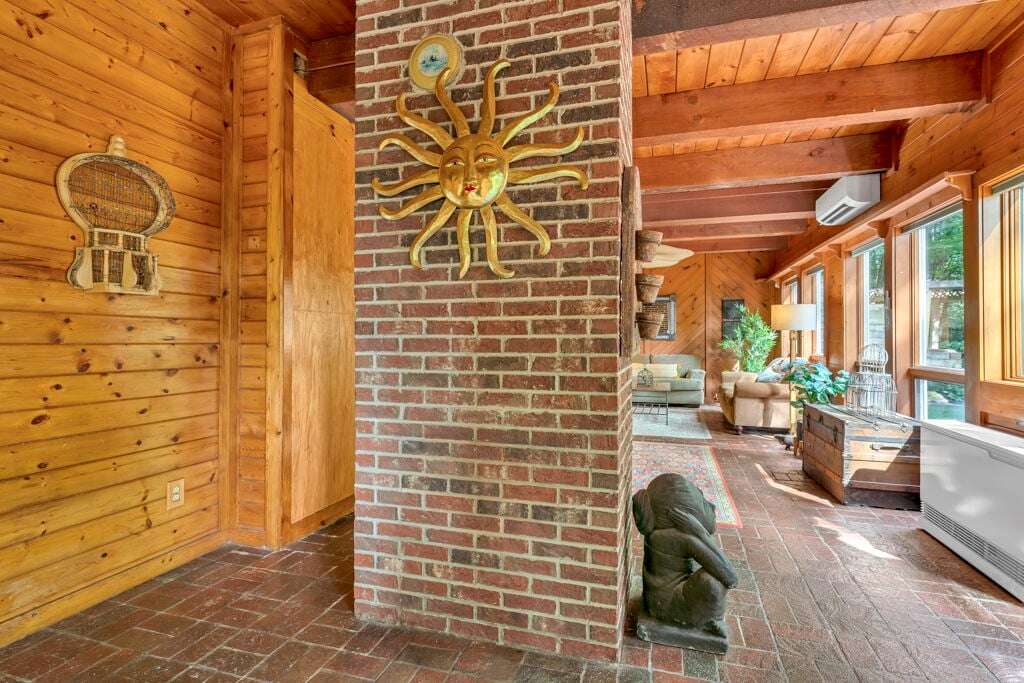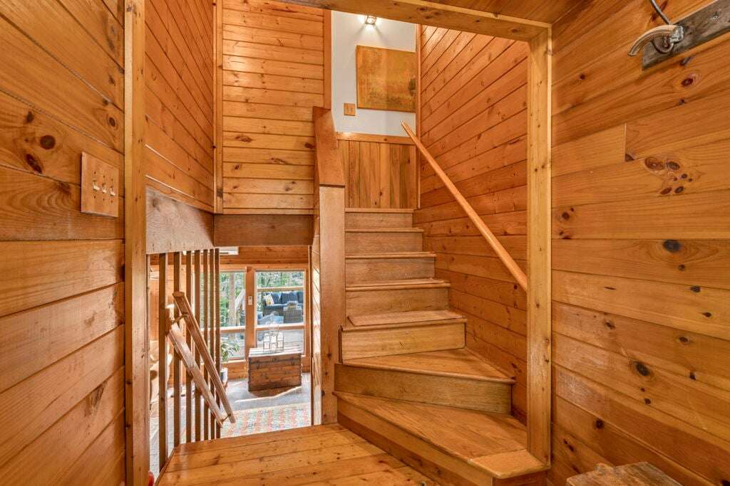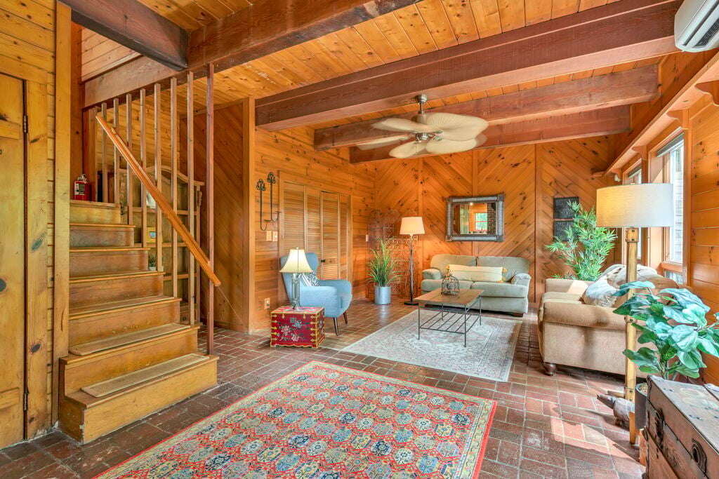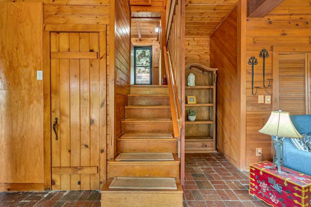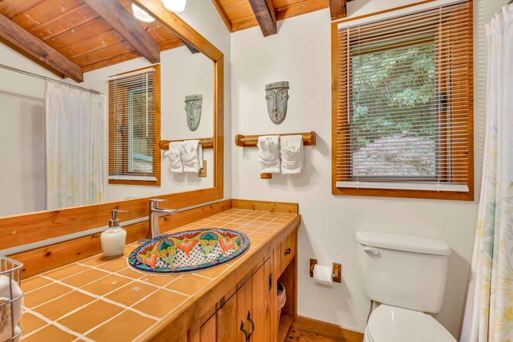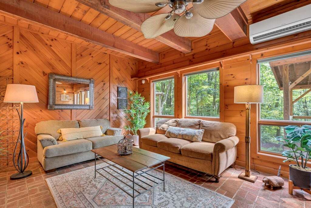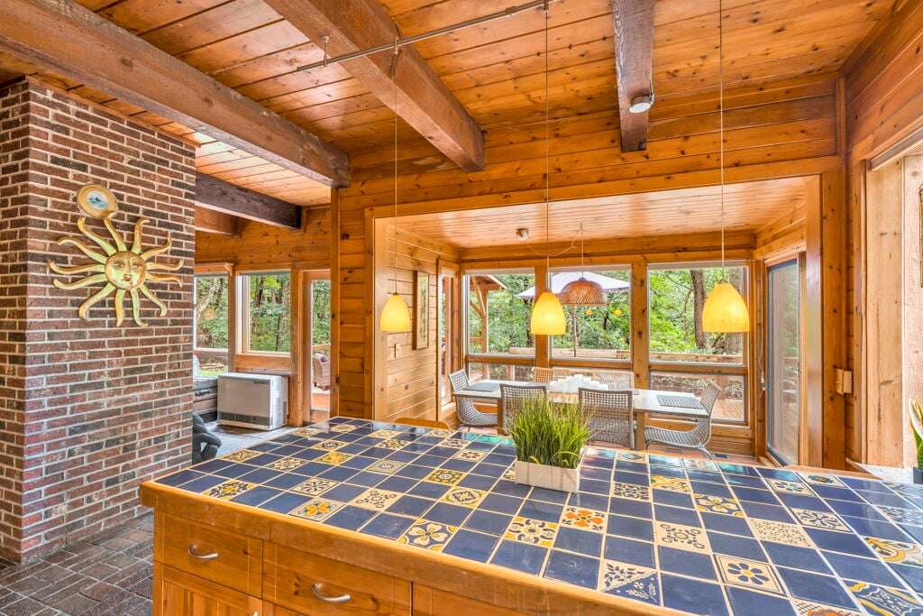 Designed with rustic mountain charm, the home blends warm wood and brick accents with modern comforts. The living room is filled with natural light from a wall of windows and skylights, bringing the tranquil forest views indoors. A spacious kitchen with custom tile counters and a dining area that opens directly to the patio make gathering and mealtime a breeze.