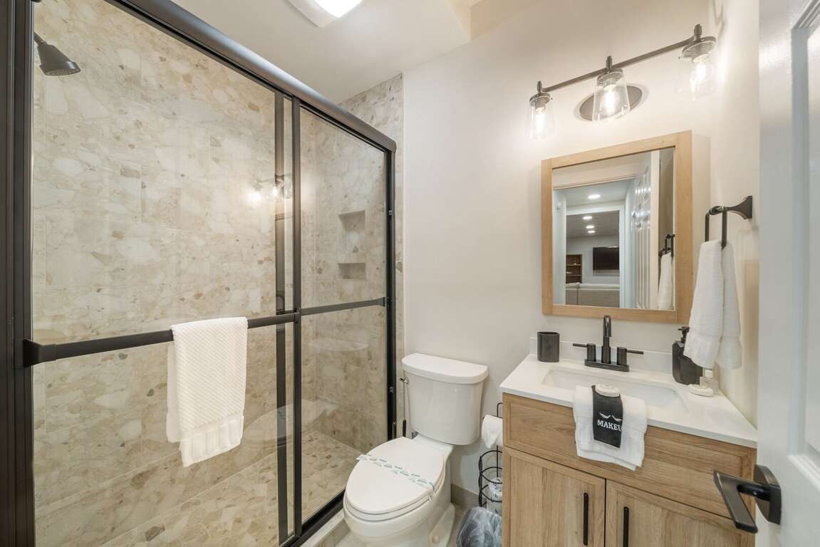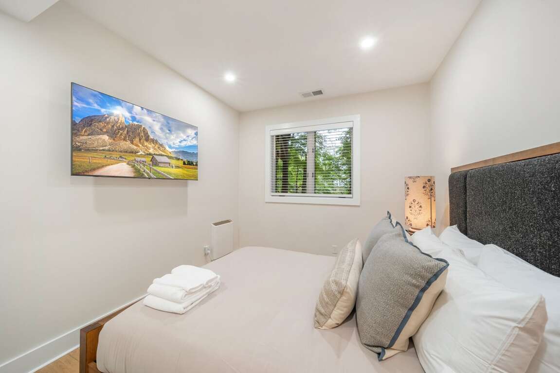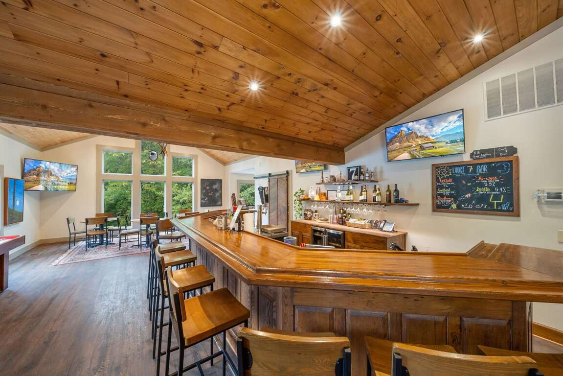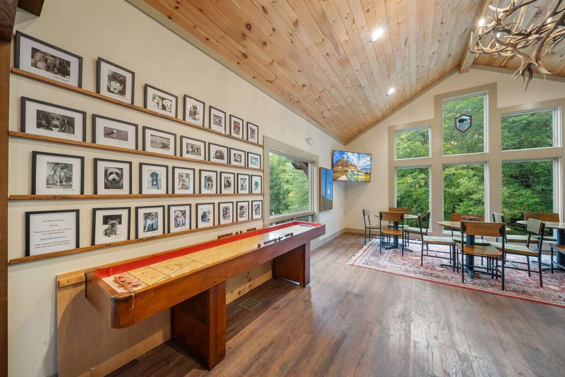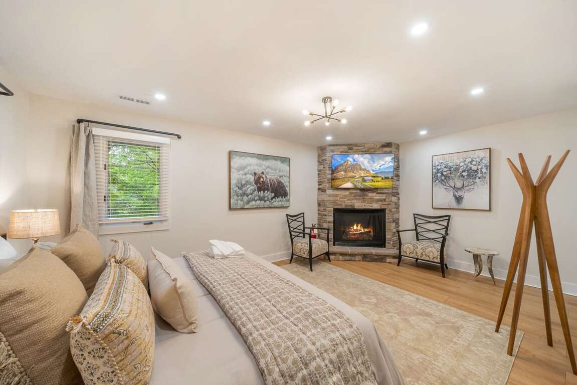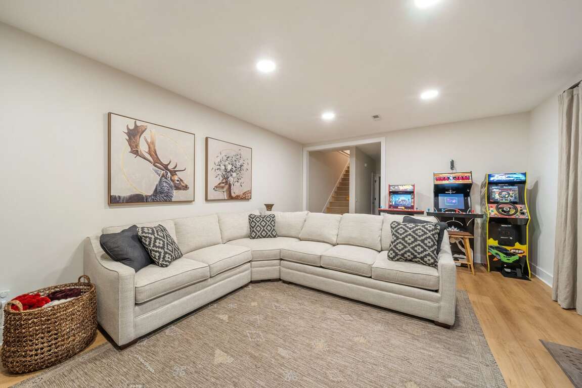 Upstairs, the master suite offers a king bed, gas fireplace, TV, ensuite bath, and a queen sleeper sofa. The lower level includes a spacious den with a large sectional sofa, TV, and multiple arcade games, plus two additional bedrooms—a queen room and a bunk room—that share a full bathroom.