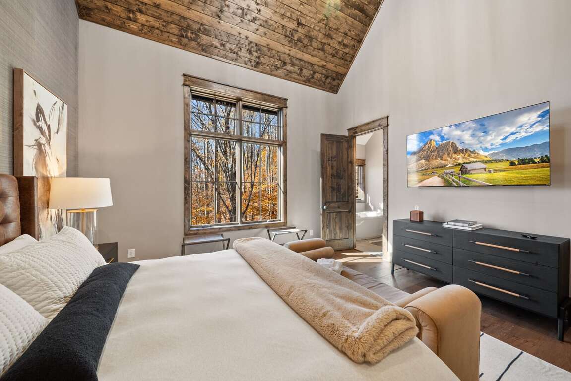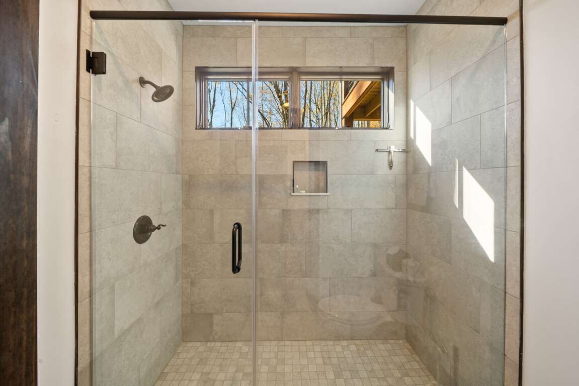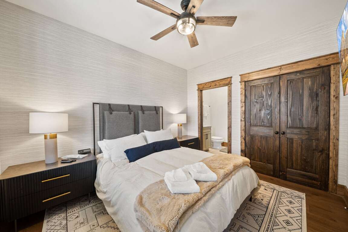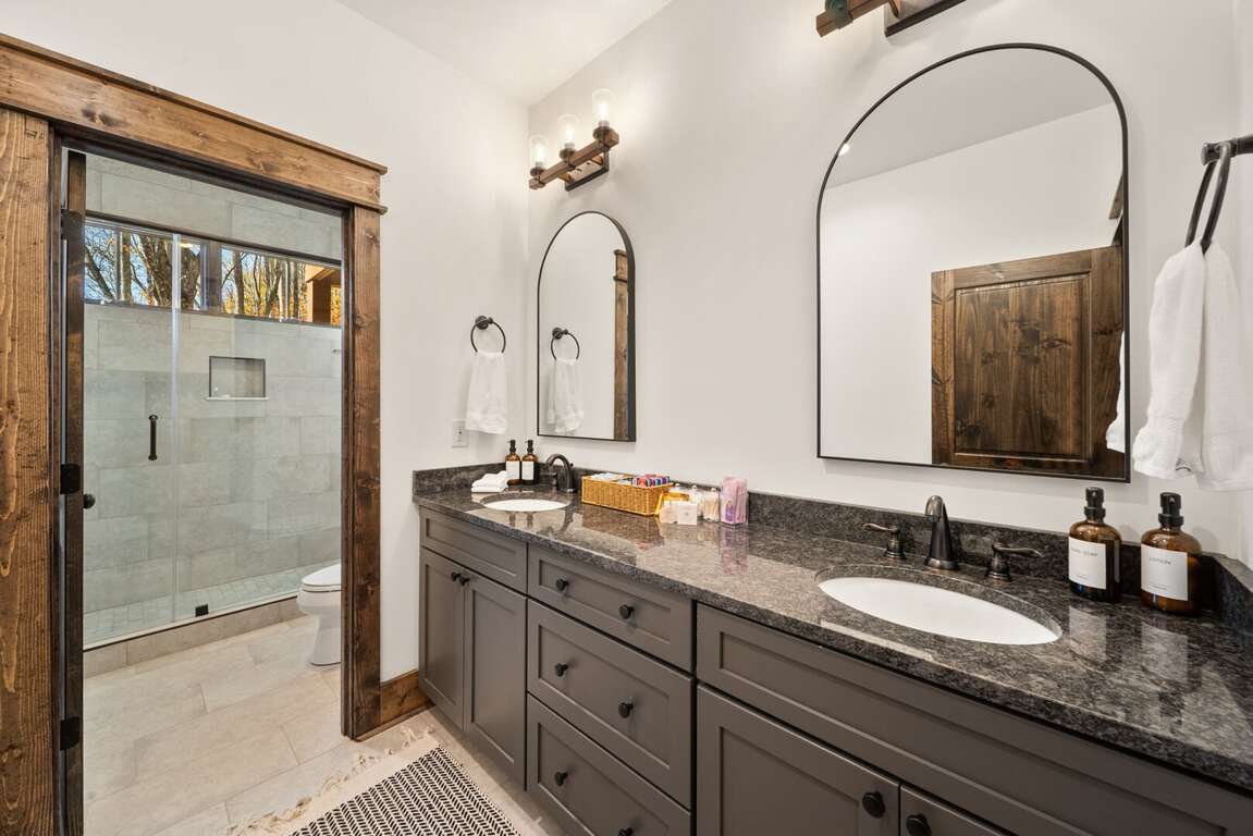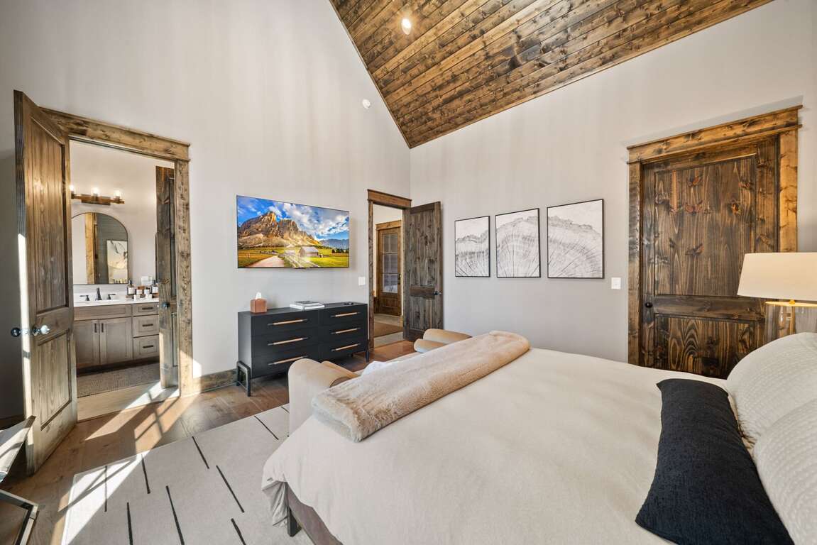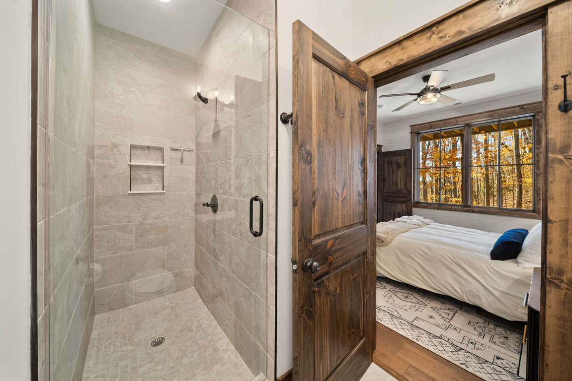 The main-level king suite is a quiet retreat with a spa-like bathroom featuring a tiled shower, soaking tub, and double vanity.