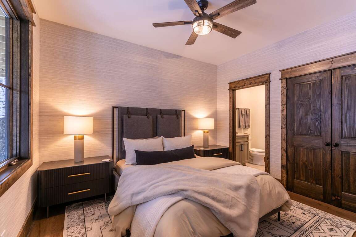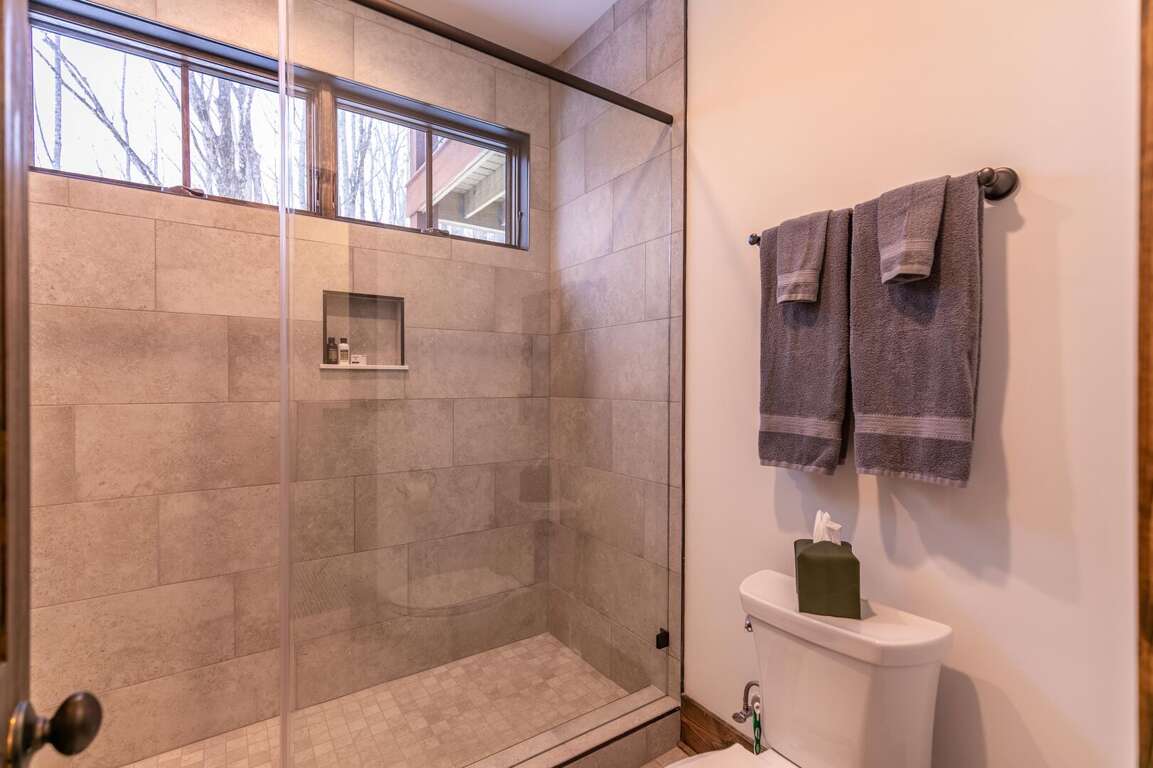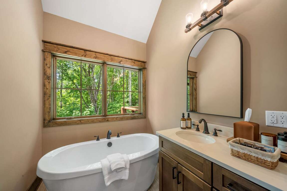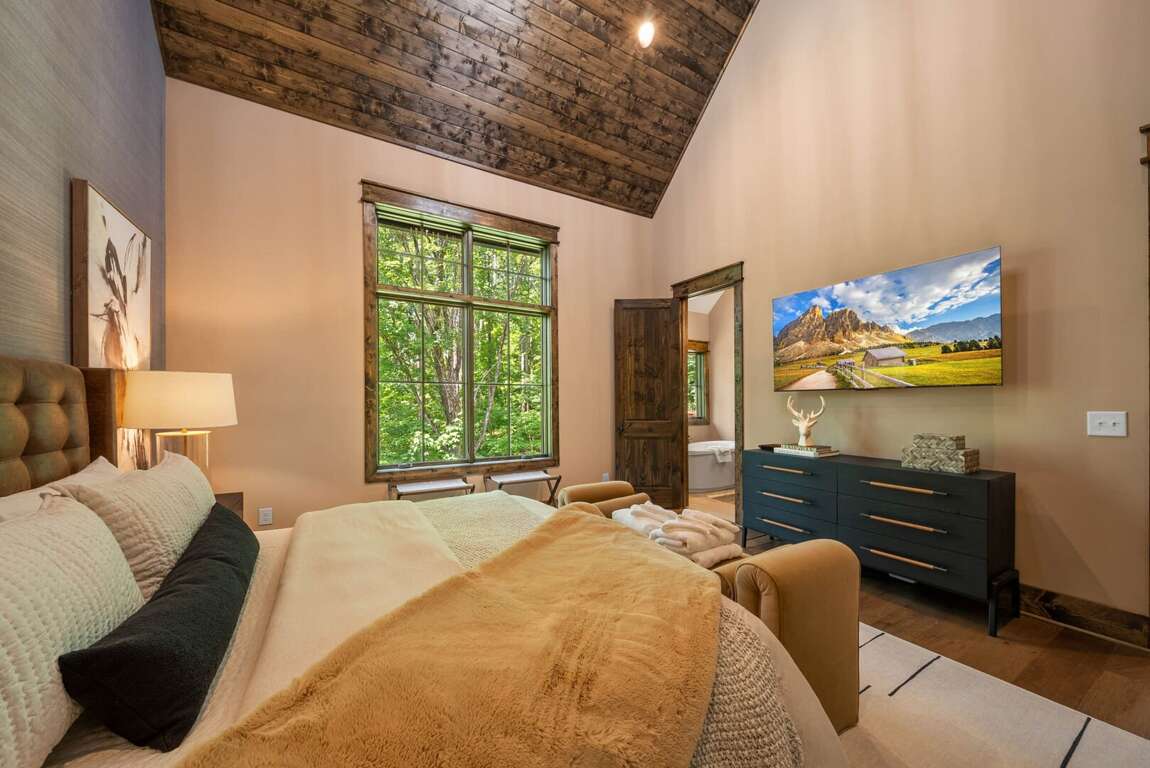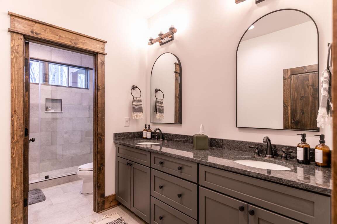 The main-level king suite is a quiet retreat with a spa-like bathroom featuring a tiled shower, soaking tub, and double vanity.