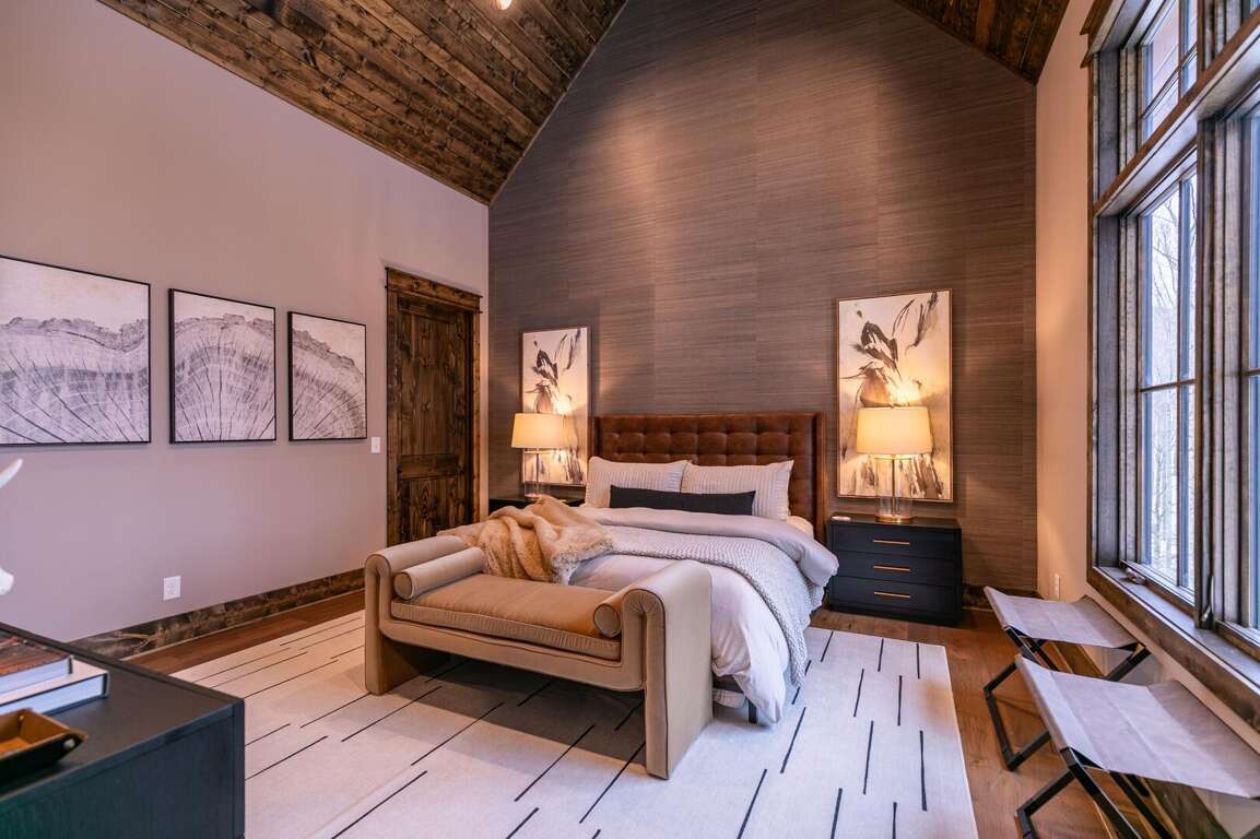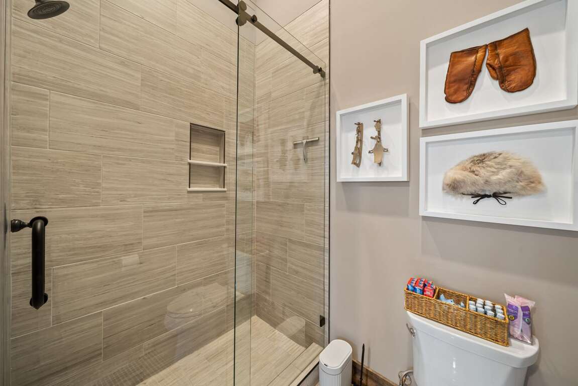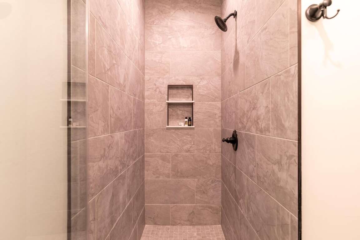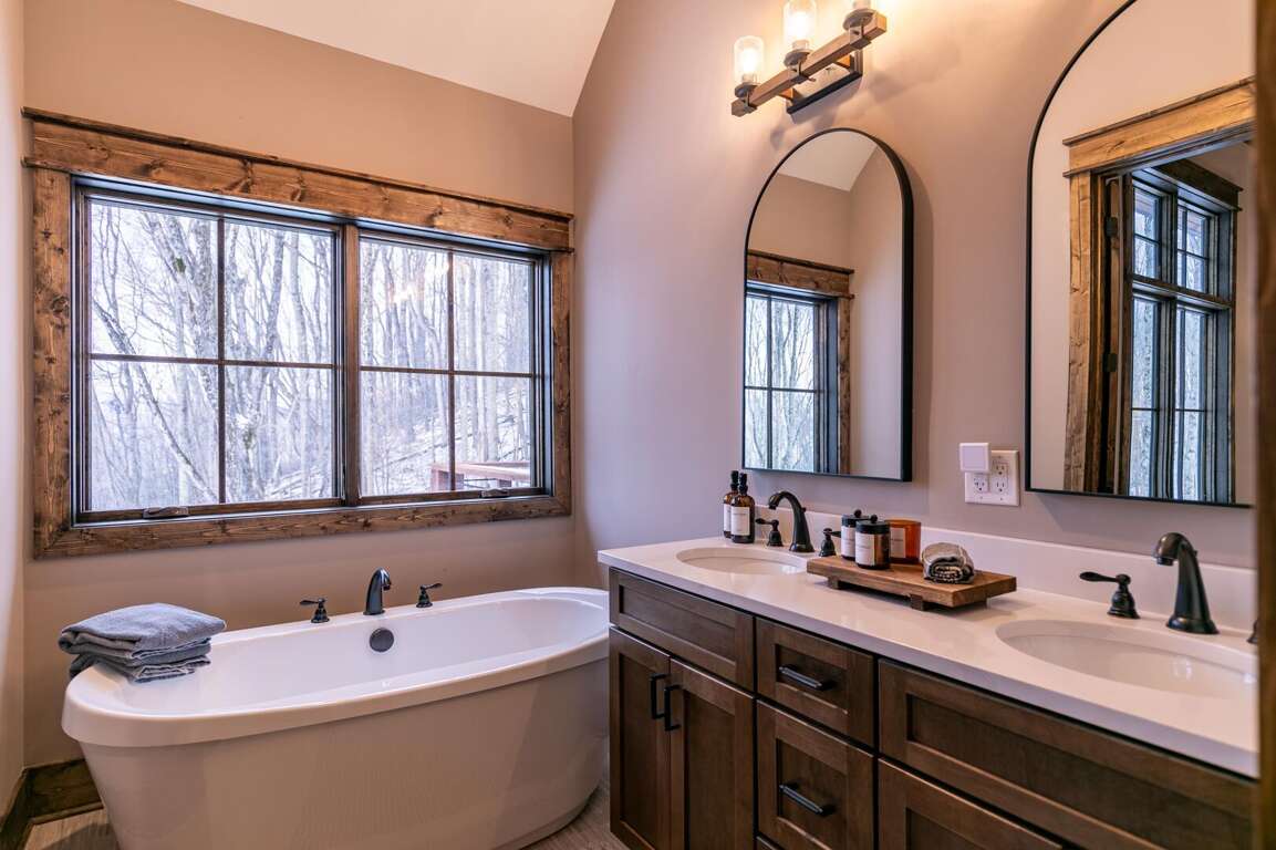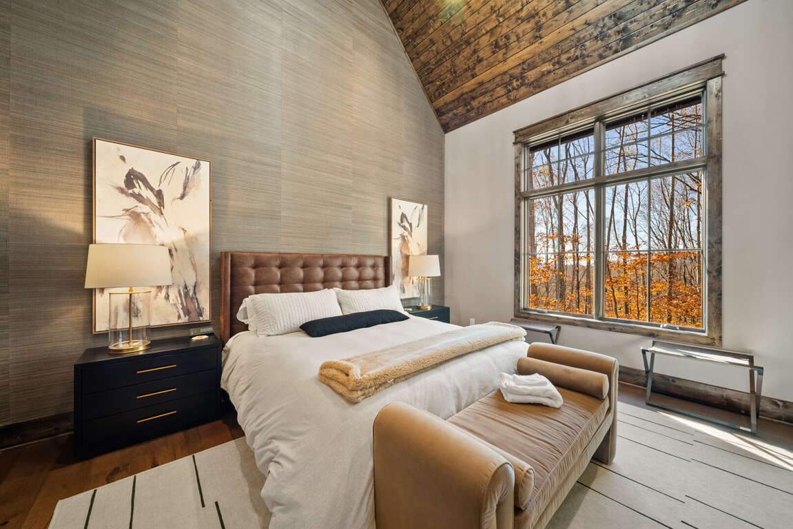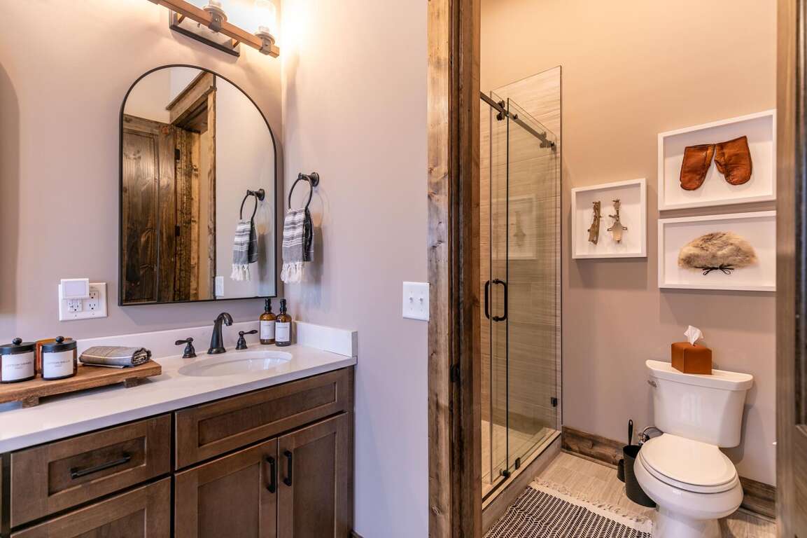 The main-level king suite is a quiet retreat with a spa-like bathroom featuring a tiled shower, soaking tub, and double vanity.
