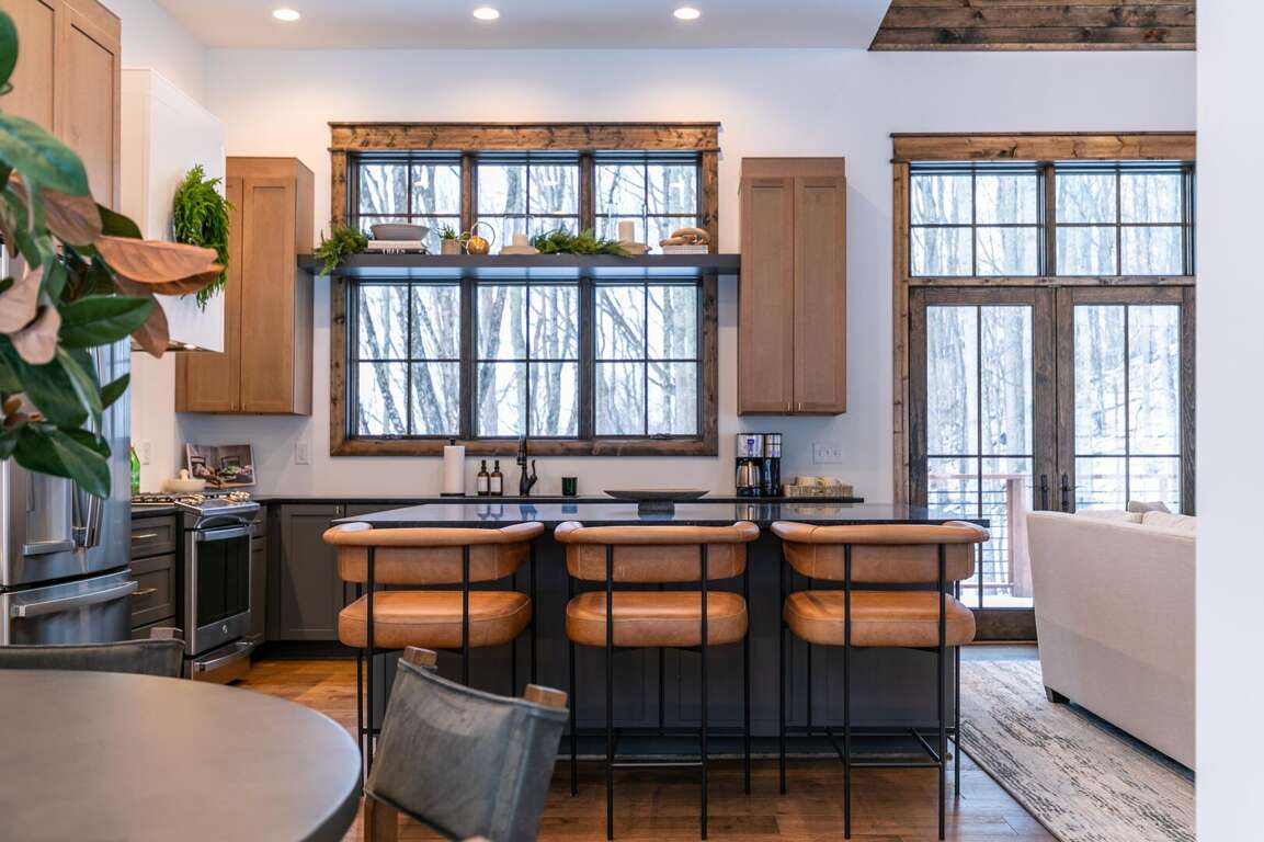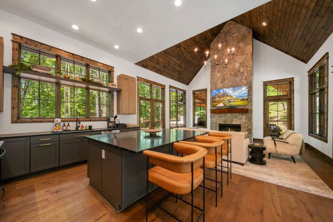 The main level features an open floor plan where everyone can gather together. The kitchen is fully equipped with modern appliances, granite counters, and a big island with three leather bar stools—great for morning coffee or chatting while meals are prepared. The dining table seats six and is just right for sharing dinners after a day of exploring.