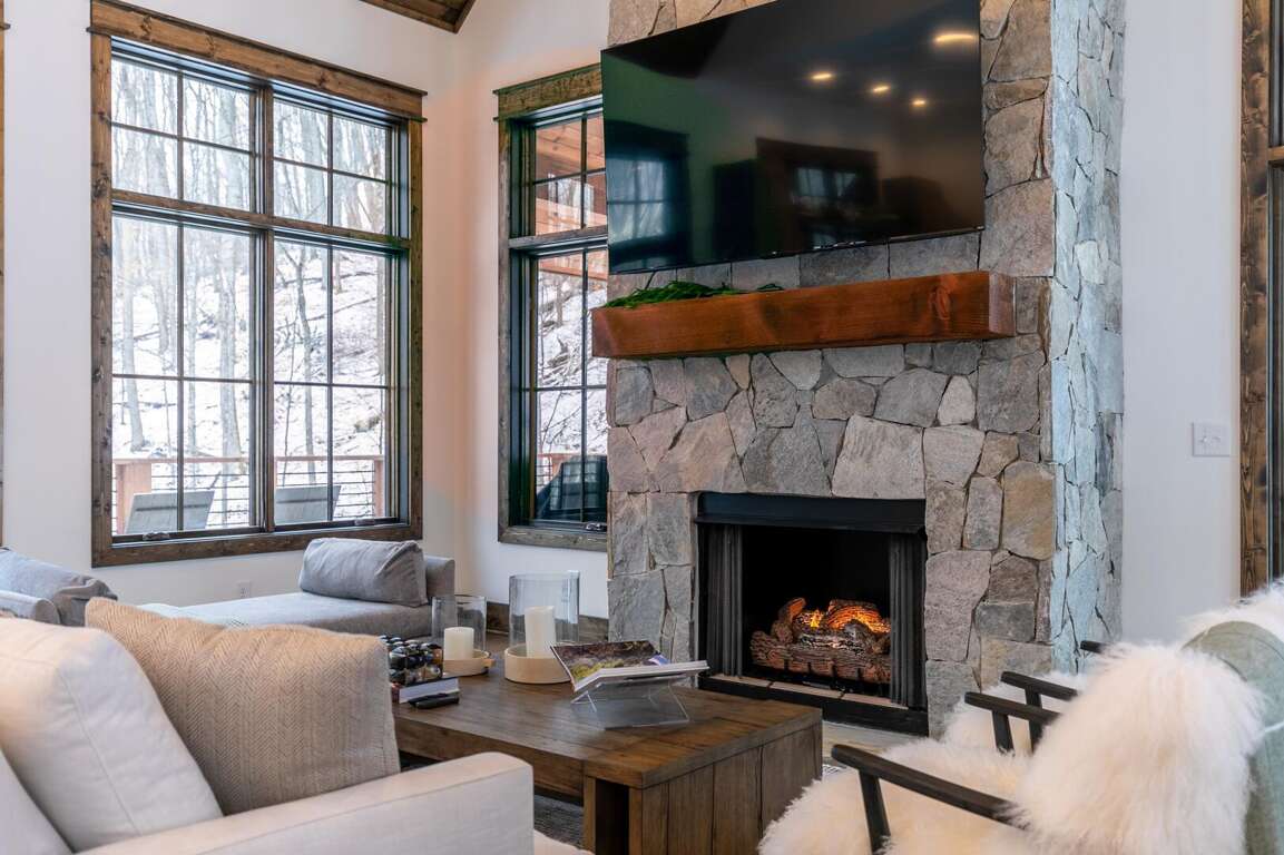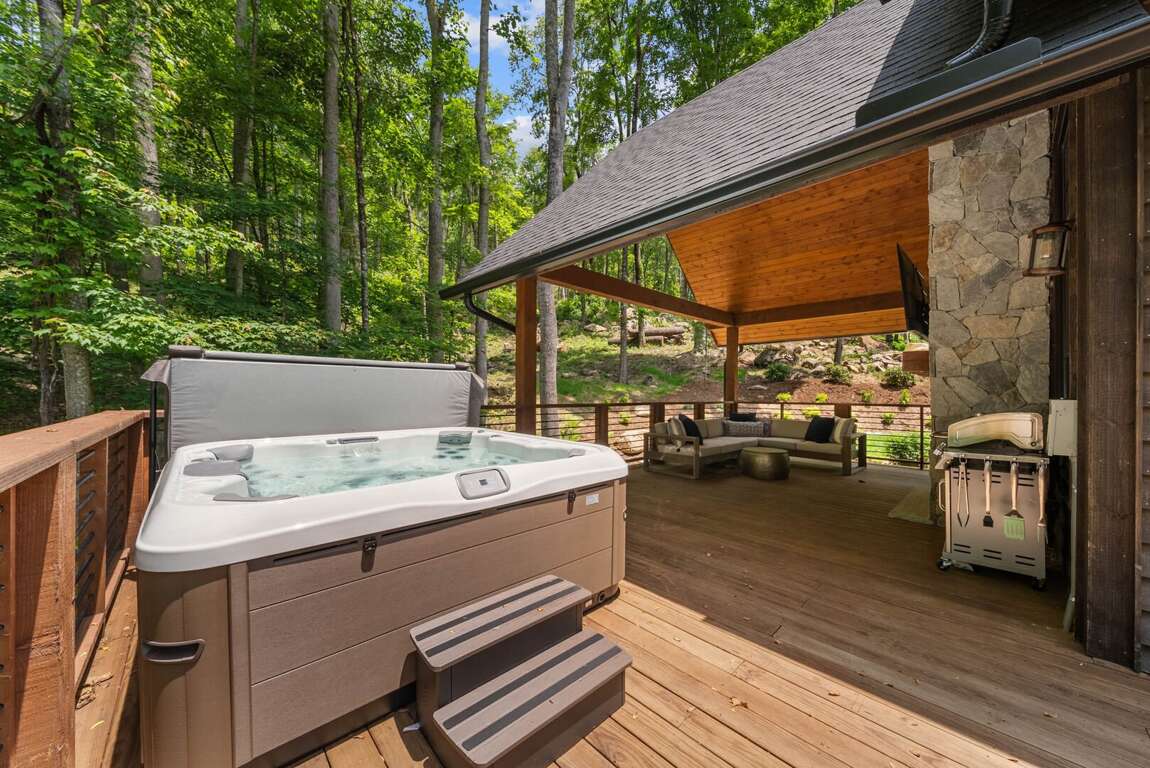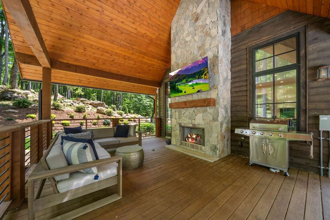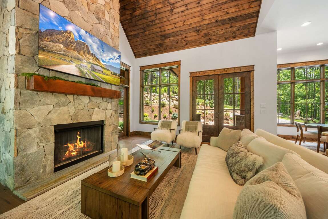 The living room has a warm, welcoming feel, centered around a gas fireplace with comfy seating and a large flatscreen TV. Two sets of doors open out to the deck so you can let the mountain air in and enjoy the view. Step outside and you’ll find a bubbling hot tub and a covered sitting area with a gas fireplace and TV—perfect for relaxing any time of day. There’s also plenty of seating, a gas grill for easy outdoor meals, and in the lower yard, a firepit for the perfect end to your day. Whether you’re watching a movie, playing games, or taking in the fresh mountain air, this space invites you to unwind and make lasting memories.