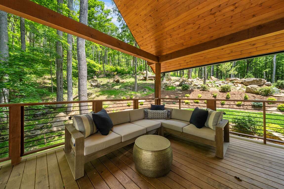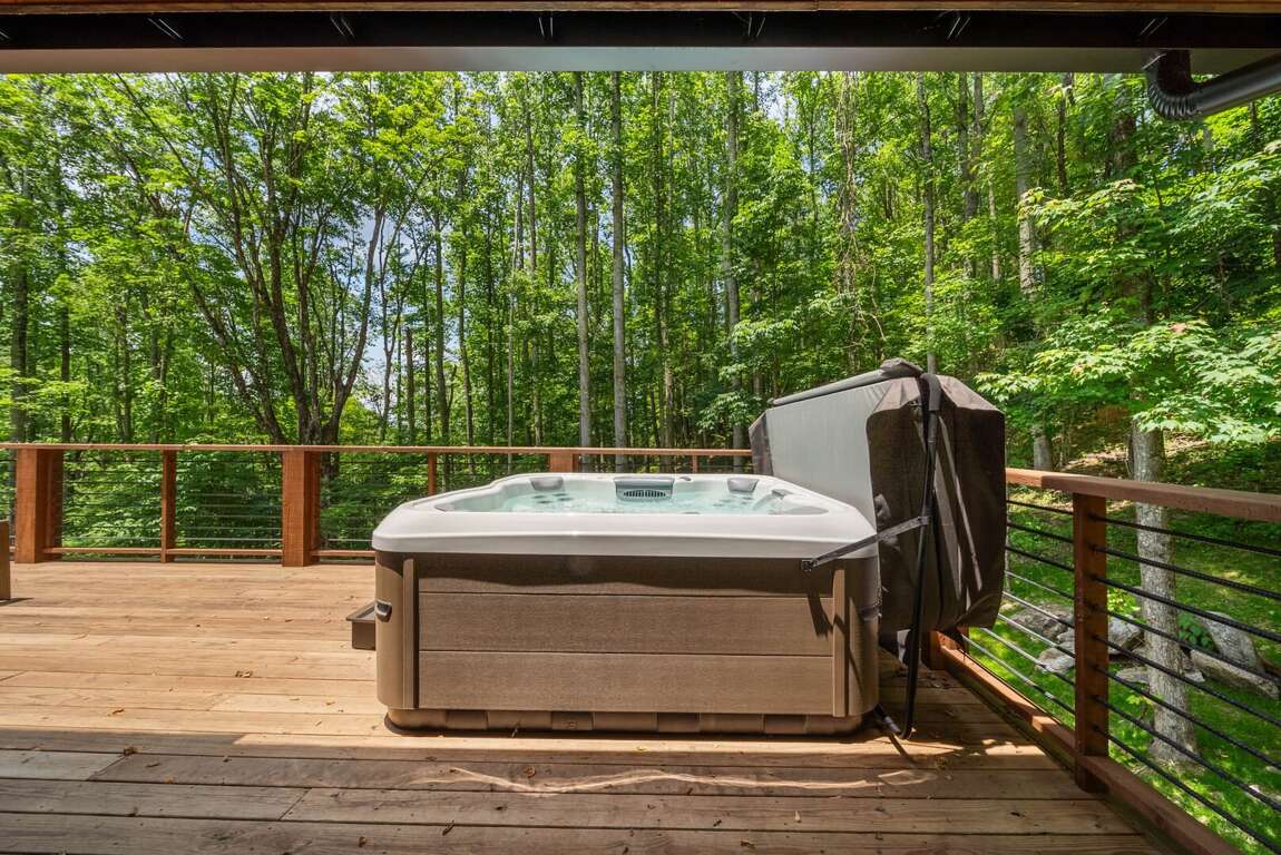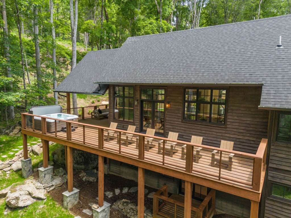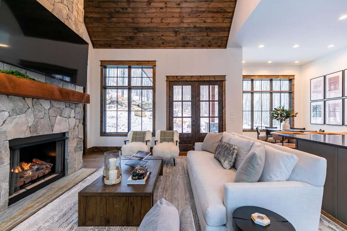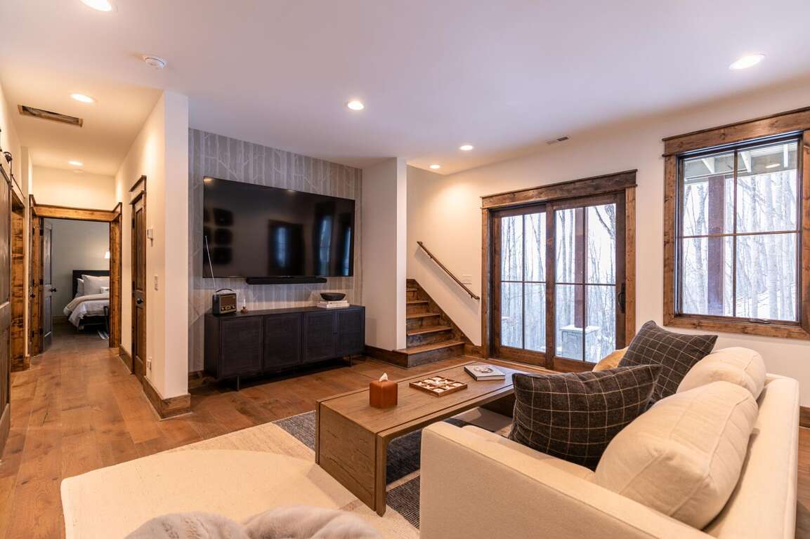 The living room has a warm, welcoming feel, centered around a gas fireplace with comfy seating and a large flatscreen TV. Two sets of doors open out to the deck so you can let the mountain air in and enjoy the view. Step outside and you’ll find a bubbling hot tub and a covered sitting area with a gas fireplace and TV—perfect for relaxing any time of day. There’s also plenty of seating, a gas grill for easy outdoor meals, and in the lower yard, a firepit for the perfect end to your day. Whether you’re watching a movie, playing games, or taking in the fresh mountain air, this space invites you to unwind and make lasting memories.