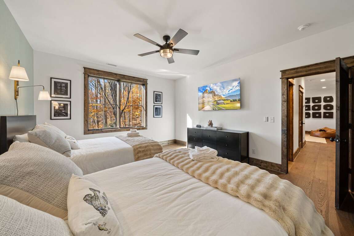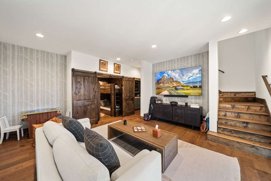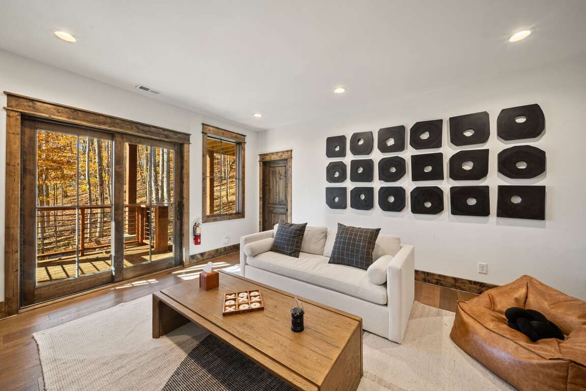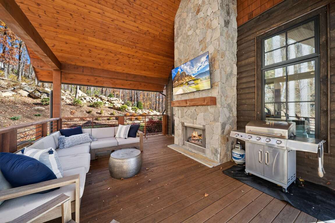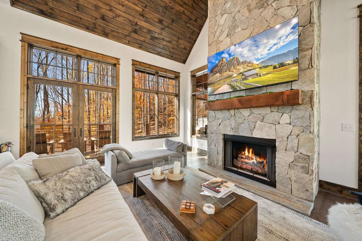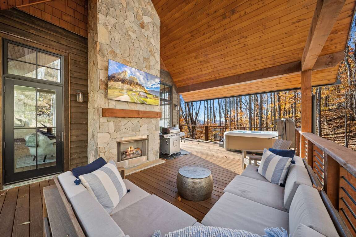 The living room has a warm, welcoming feel, centered around a gas fireplace, comfy seating, and a large flat-screen TV. Two sets of doors open out to the deck so you can let the mountain air in and enjoy the view. Step outside and you’ll find a bubbling hot tub and a covered sitting area with a gas fireplace and TV—perfect for relaxing any time of day. There’s also plenty of seating, a gas grill for outdoor meals, and in the lower yard, a fire pit for the perfect end to your day. Whether you’re watching a movie, playing games, or taking in the fresh mountain air, this space invites you to unwind and make lasting memories.