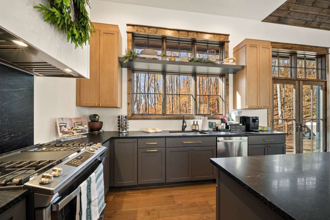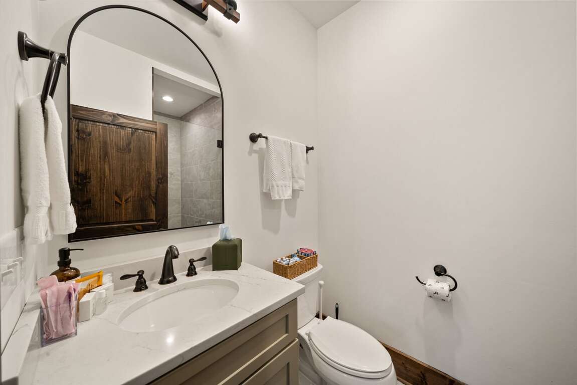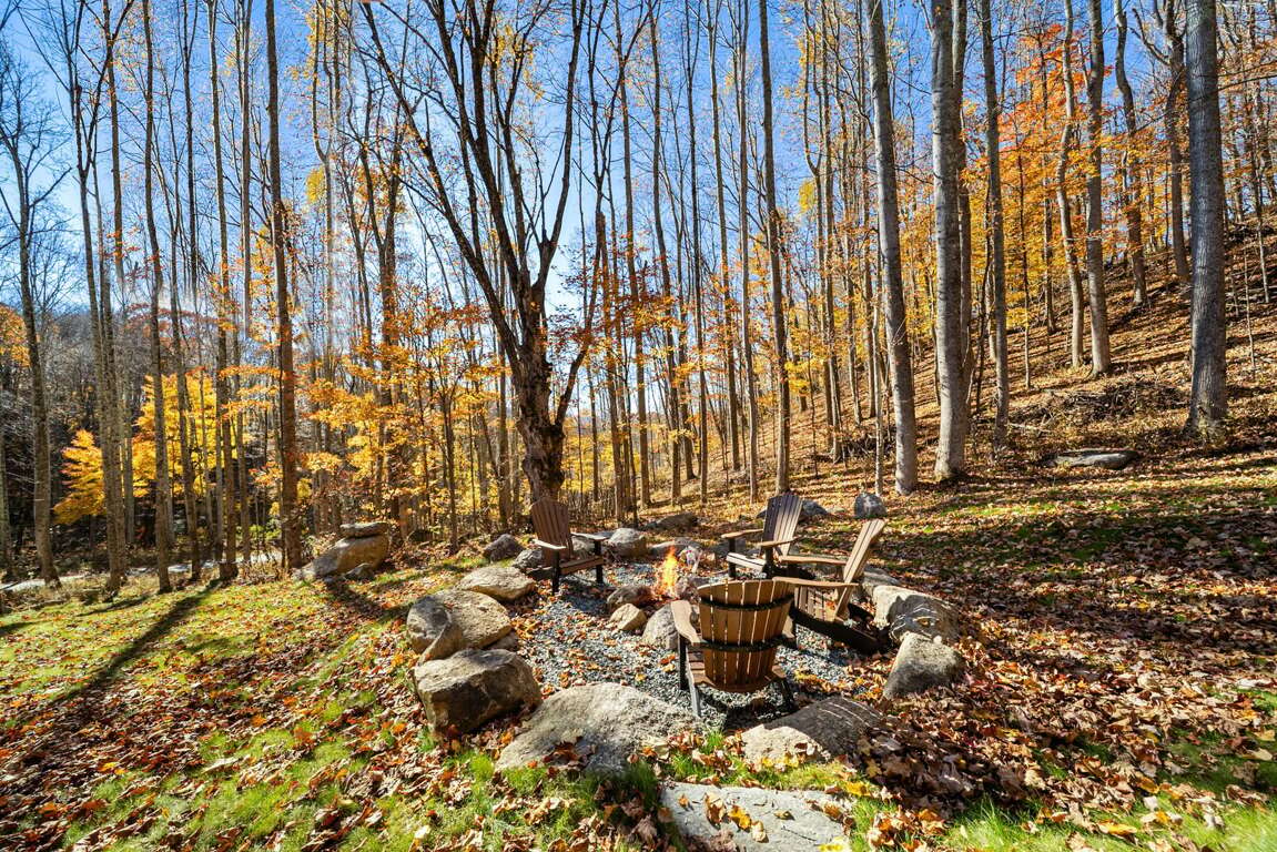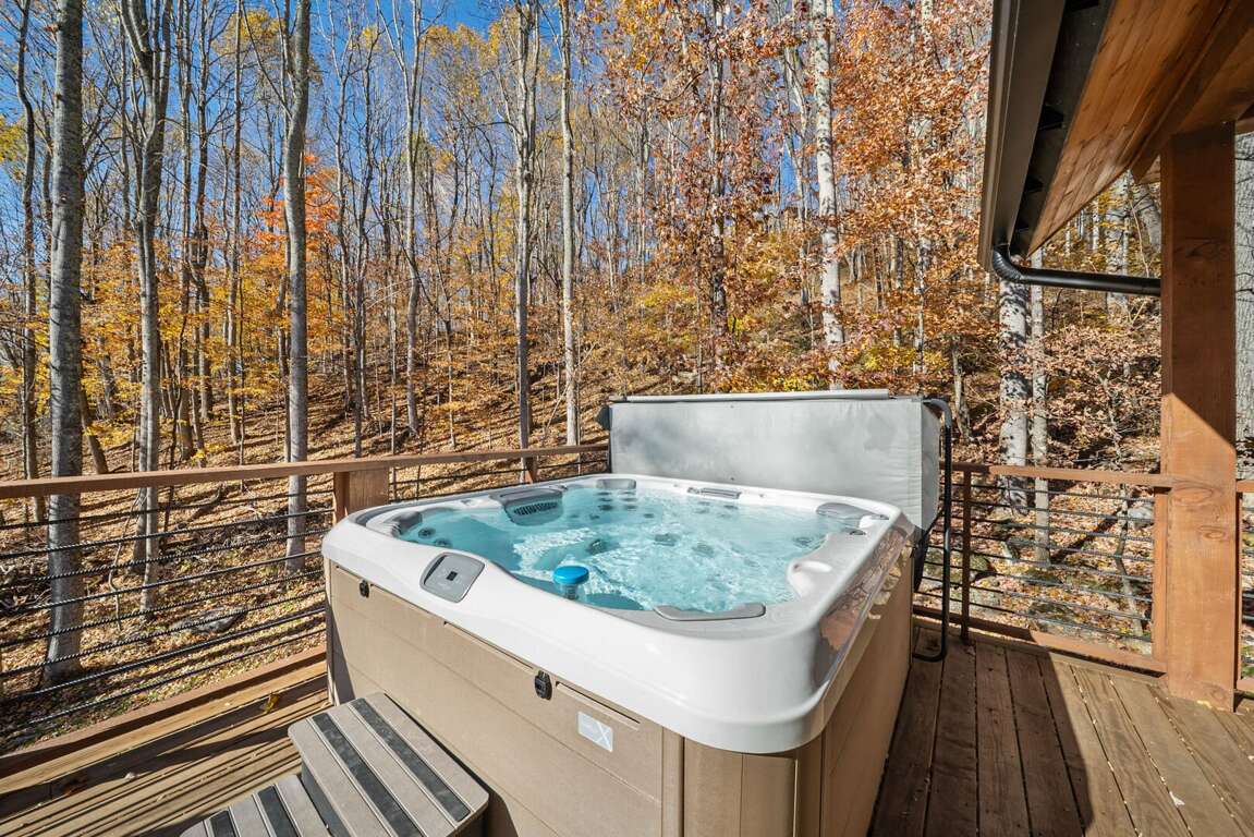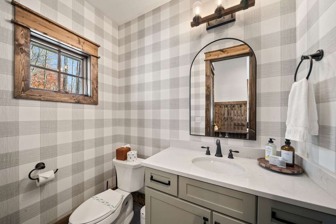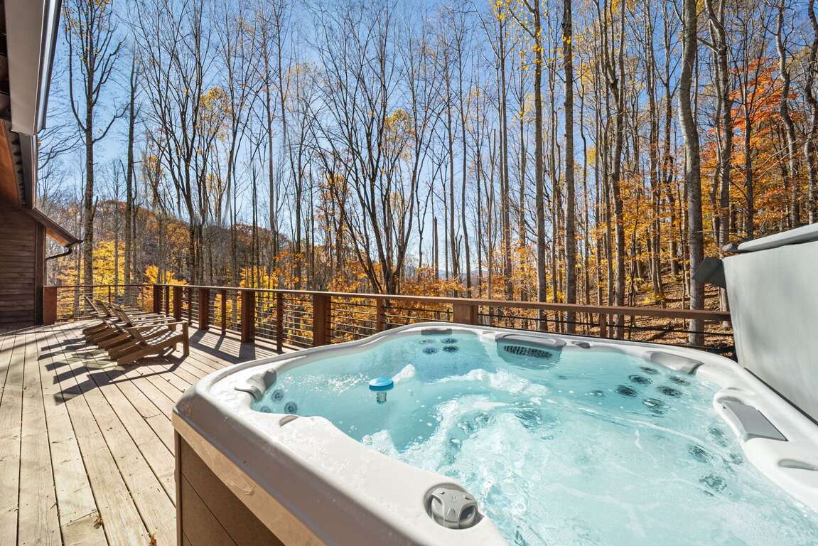 The living room has a warm, welcoming feel, centered around a gas fireplace, comfy seating, and a large flat-screen TV. Two sets of doors open out to the deck so you can let the mountain air in and enjoy the view. Step outside and you’ll find a bubbling hot tub and a covered sitting area with a gas fireplace and TV—perfect for relaxing any time of day. There’s also plenty of seating, a gas grill for outdoor meals, and in the lower yard, a fire pit for the perfect end to your day. Whether you’re watching a movie, playing games, or taking in the fresh mountain air, this space invites you to unwind and make lasting memories.