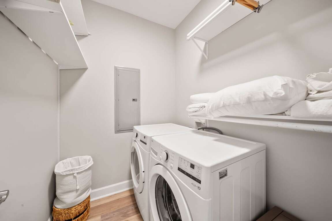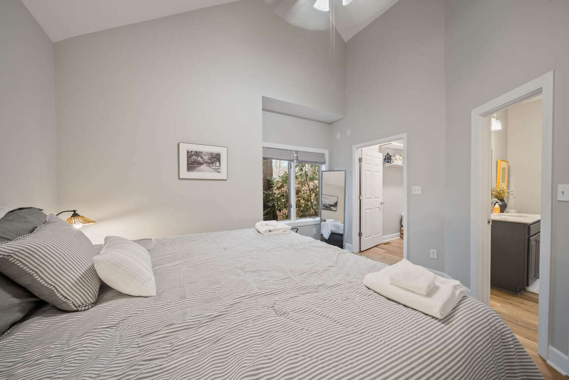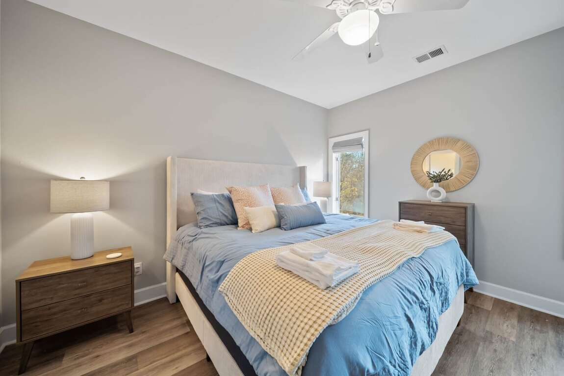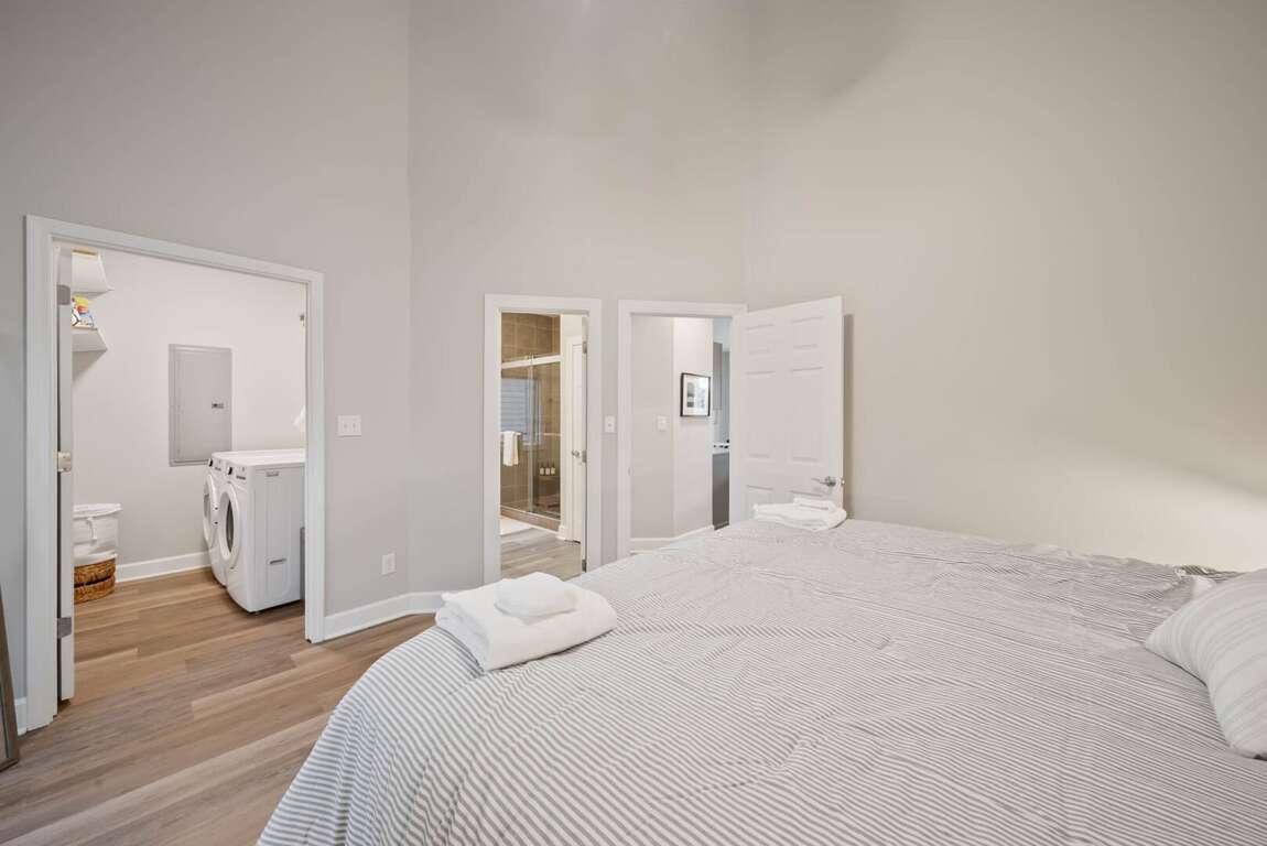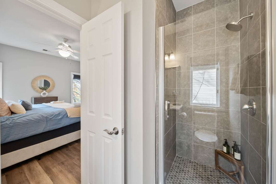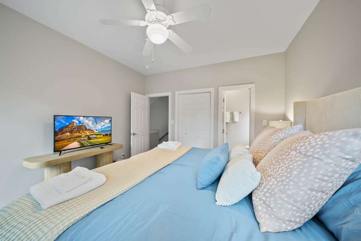 The main level offers a restful king bedroom with quality linens, blackout Roman shades, and a ceiling fan for comfort. Just off the bedroom is a convenient laundry area with an LG washer and dryer. The en suite bathroom features a newly tiled walk-in shower with a glass enclosure, a teak spa stool, and complimentary shampoo, conditioner, and body wash. Upstairs, guests will find a second king bedroom with comfortable linens, blackout Roman shades, and a 43” TV. This room includes a closet with hangers, a luggage rack, and a chest of drawers for storage. The en suite bathroom is also thoughtfully updated with a tiled walk-in shower, teak spa stool, and complimentary toiletries, creating a peaceful and private retreat on its own level. For added sleeping, the living room sofa converts to a queen bed.