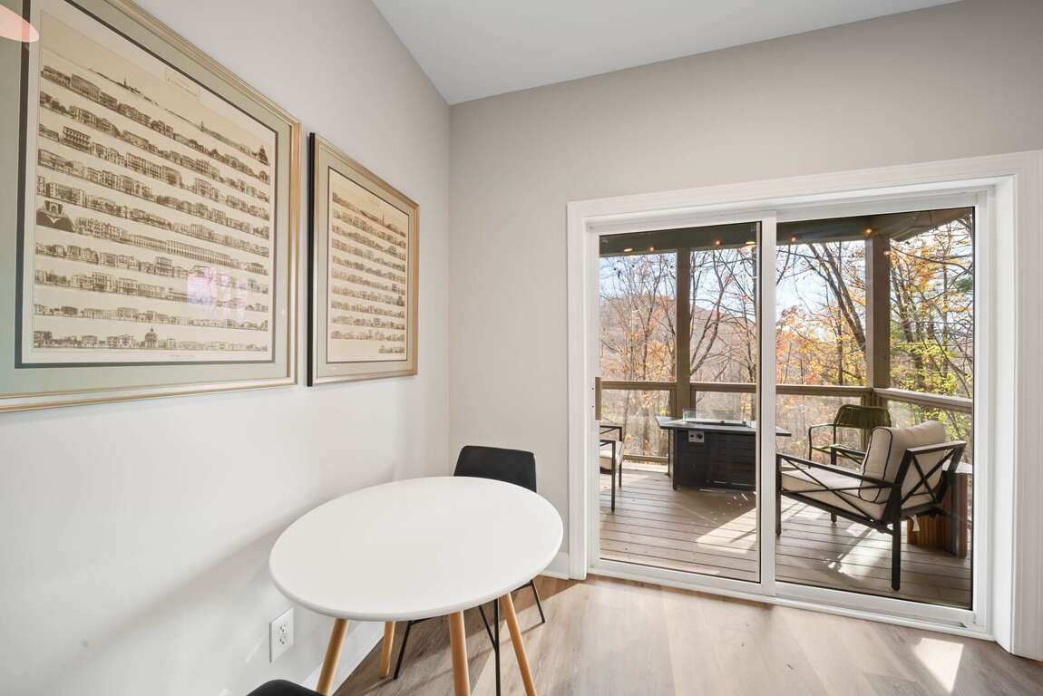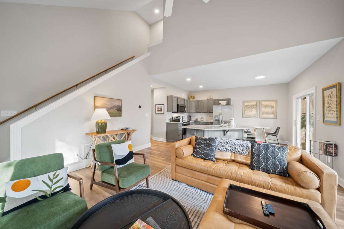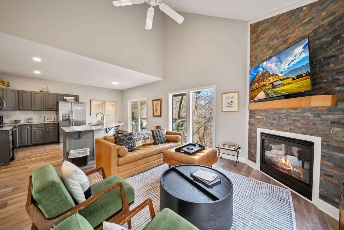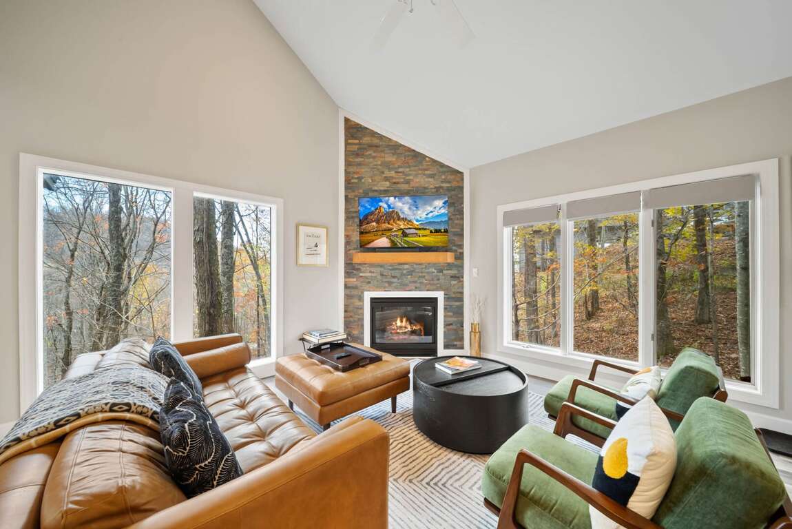 Nestled among the trees, the home’s nearly 1,200 sq ft layout feels both spacious and cozy. The main living area features soaring ceilings and five large windows that create a peaceful “treehouse” ambiance. A stone fireplace, leather seating, curated accent chairs, and a 55” TV make the space perfect for slow mornings or relaxed evenings.