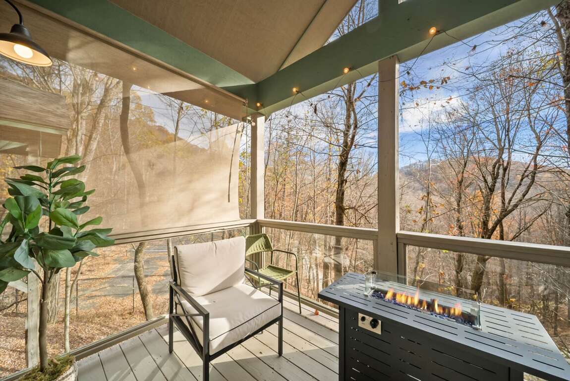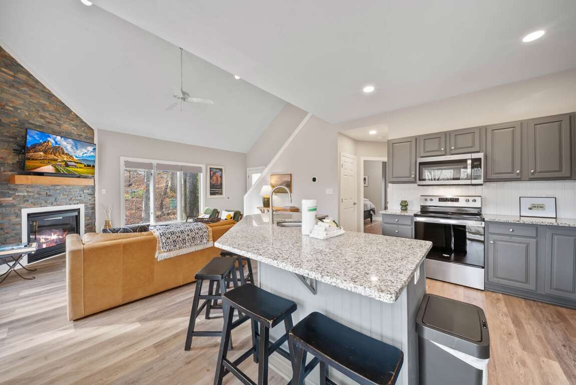 The fully stocked kitchen features new stainless steel appliances, granite countertops, and bar seating at the kitchen island. A dining table sits nearby for sit-down meals or conversation over coffee. Just off the kitchen, a sliding glass door leads to the private covered deck—a guest favorite. Enjoy outdoor seating with cushions, a privacy screen, string lights, and a gas fire table—all overlooking fresh mountain air at 3,500 ft elevation.