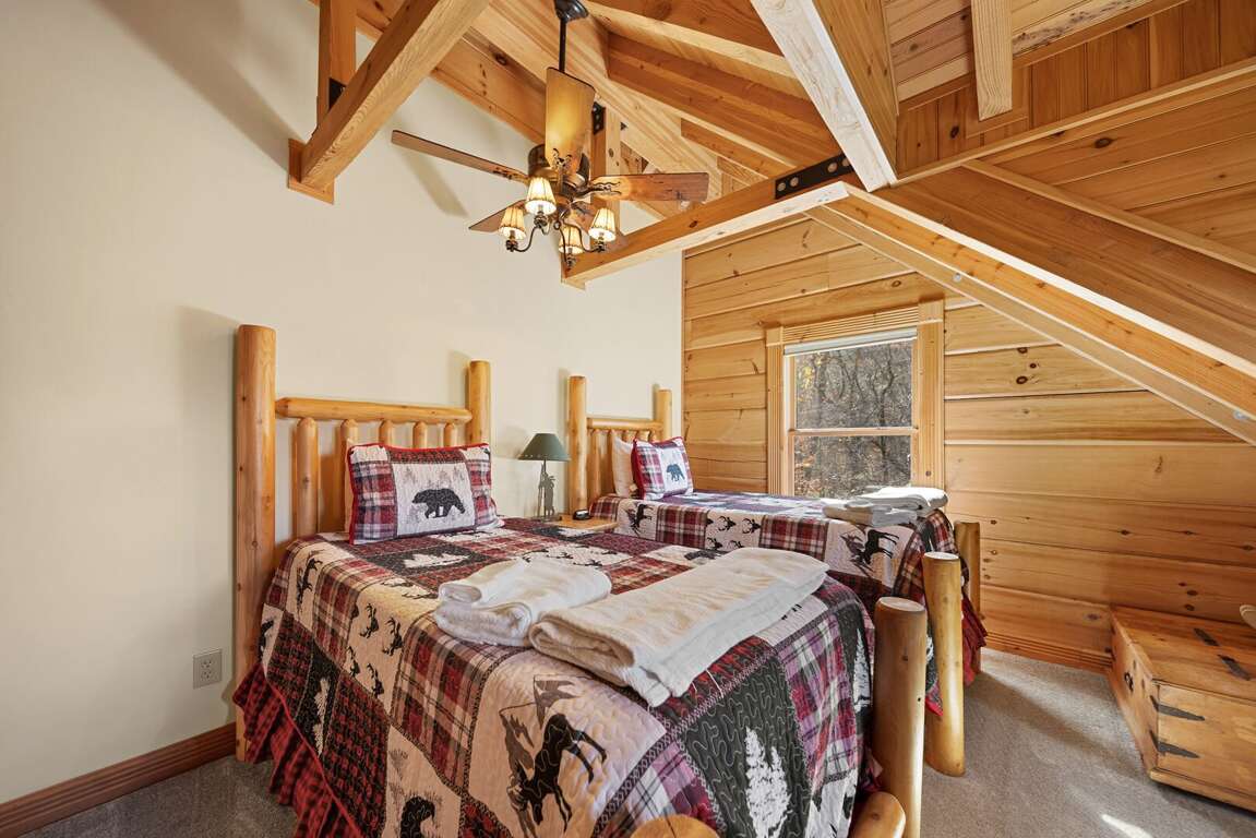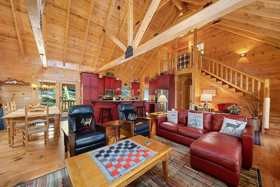 Sugars Cozy Cabin is a beautifully crafted log cabin with an open-concept main floor. The great room features vaulted ceilings with exposed beams, warm wood walls, and a stacked stone fireplace that creates a cozy focal point. Sink into the leather sofa and relax by the gas fireplace after a day on the slopes or exploring the High Country.
