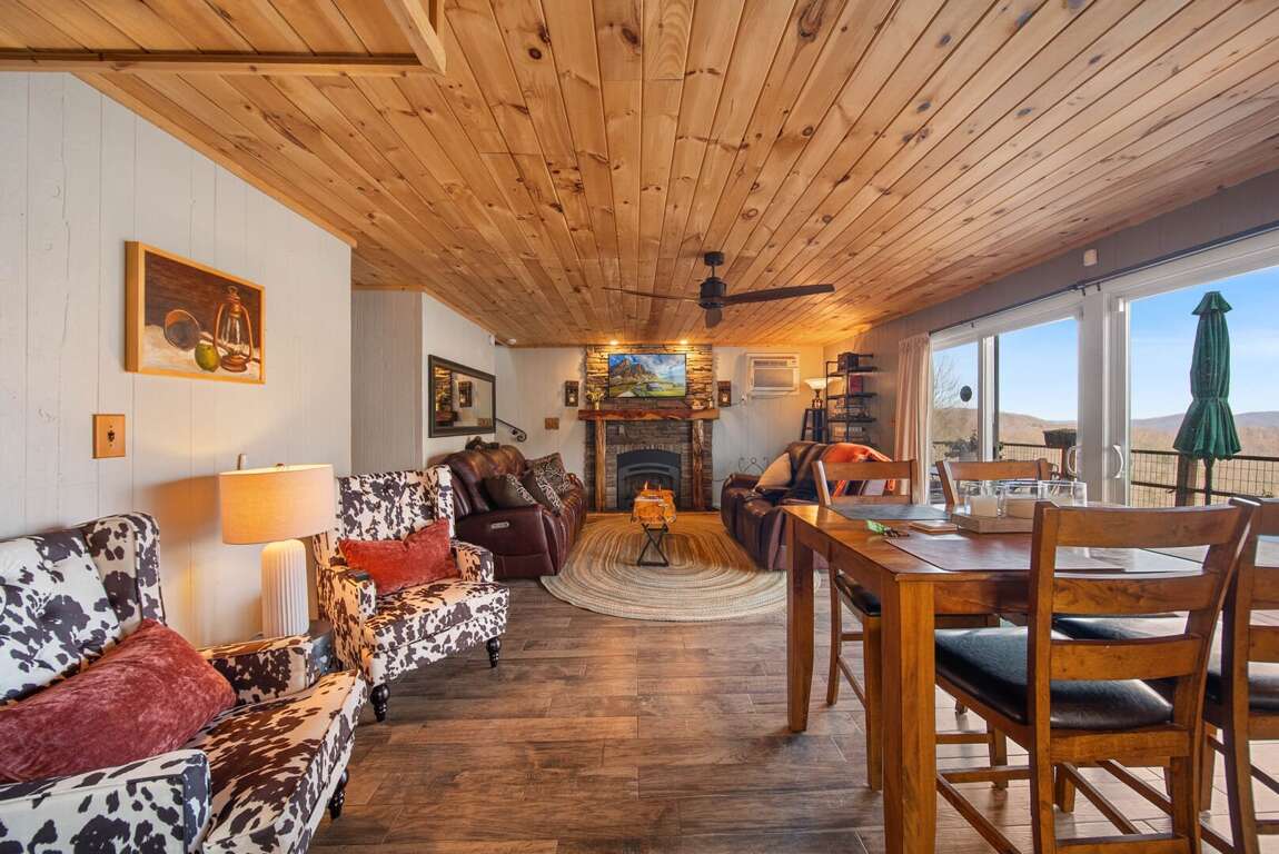 Step into the main living area and instantly feel at home. A dramatic stacked-stone gas fireplace anchors the room, paired with oversized windows that bring in natural light and panoramic views. Sink into the leather sofa, enjoy evenings by the fire, or gather for movie nights on the mounted TV.