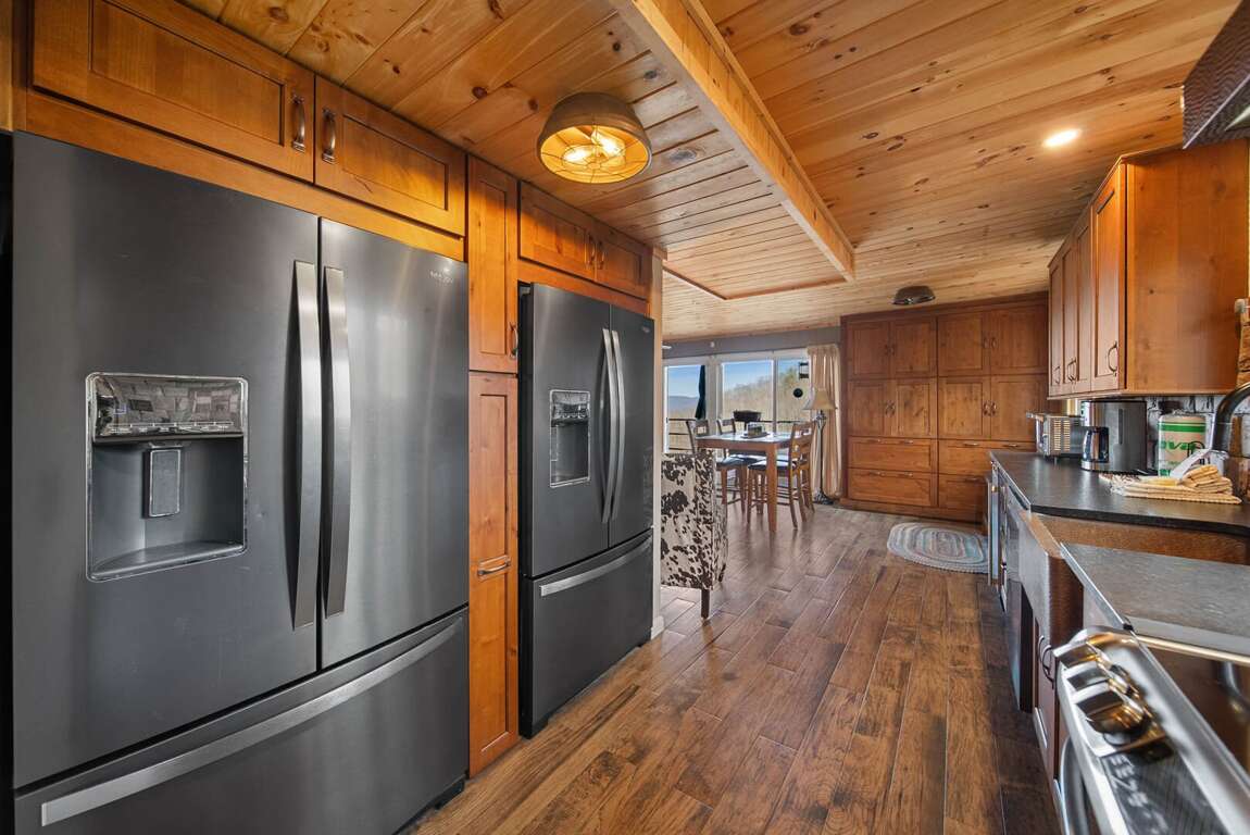 The open kitchen is ideal for groups who love to cook and connect. Featuring two full-size refrigerators, sleek counters, a ceramic cooktop, ice maker, and plenty of prep space, it’s built for everything from pancake breakfasts to holiday dinners. The dining table seats eight and the nearby high top breakfast table seats an additional 4 guests—perfect for meals, board games, or planning the next day’s adventures.