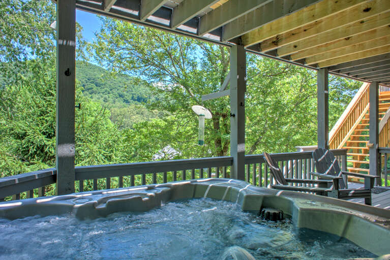 Nestled within the picturesque landscape of a quiet South Asheville neighborhood, Blue Sky Manor offers an array of outdoor amenities that cater to both relaxation and recreation. The upper deck provides a perfect spot for outdoor dining with its gas grill and stunning mountain views, while the stone-stacked, smokeless fire pit on the patio is ideal for cozy gatherings. Additionally, the bubbling hot tub on the lower deck offers a relaxing retreat with beautiful vistas. The property's outdoor seating area allows guests to soak in the natural surroundings in comfort. Whether enjoying a meal al fresco or simply unwinding amidst the mountain scenery, the outdoor spaces at Blue Sky Manor provide the freedom to savor the great outdoors in style.