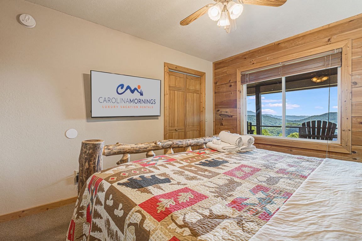 Experience the ultimate mountain retreat at Daze Off, a stunning log cabin lodge nestled on 1.5 acres in a private community. This haven offers breathtaking long-range mountain views that will leave you in awe. The classic log cabin features a grand great room with a soaring cathedral ceiling, an open floor plan, and a massive stone fireplace, perfect for cozy gatherings.