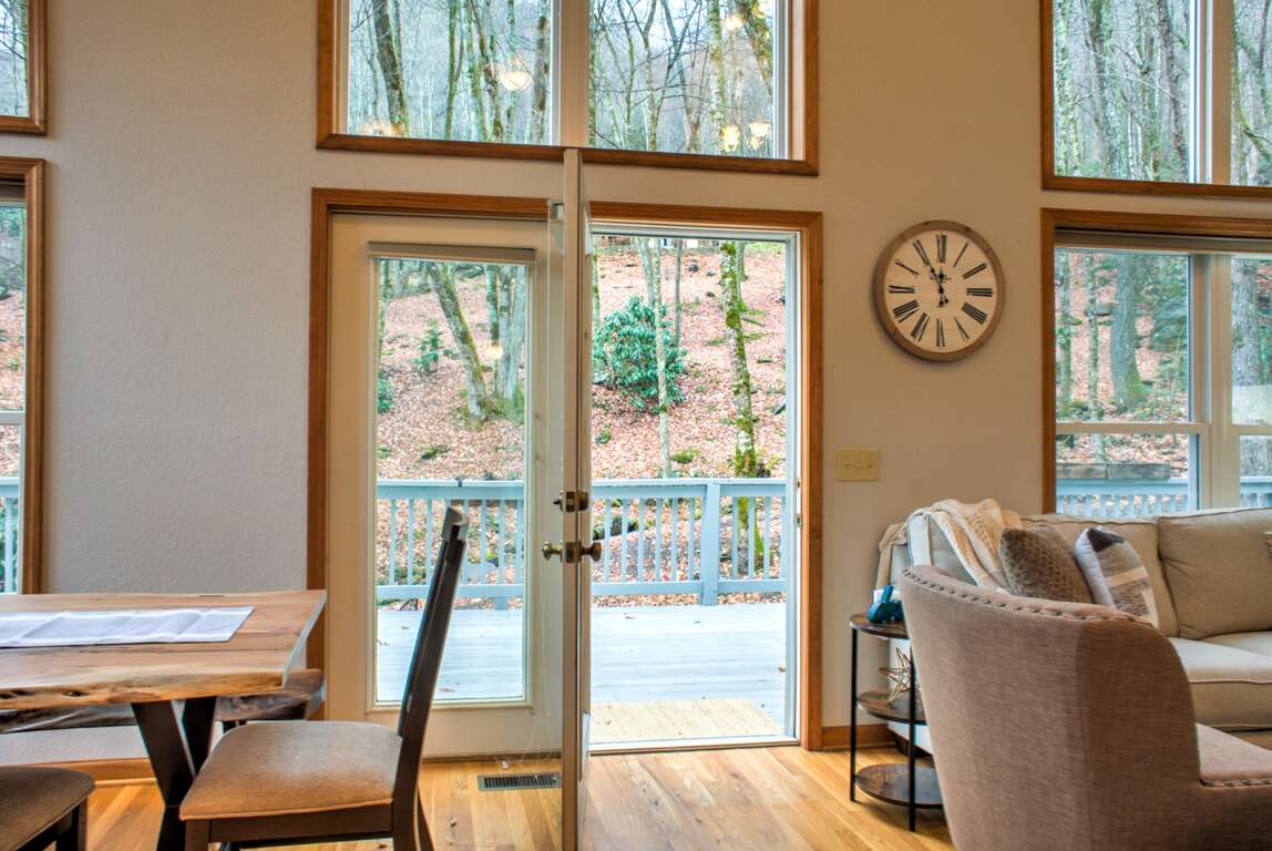 The relaxing tone of your vacation begins with the ever-present sound of the babbling creek that runs through the yard. Wake up to a cup of coffee at the kitchen bar and greet the day with birds singing in the forest. Floor-to-ceiling windows let tons of light into the house all day. Spend family time together seated at the beautiful live edge dining table. The convenience of being able to make your favorite meals while on vacation is unbeatable! Cool mountain nights are perfect for cozying up by the gas fireplace to enjoy a movie. The main level primary bedroom is private with a full bath, and the upper level offers a home office area along with a second bedroom and full bath. Cherish the peacefulness of a nature-inspired getaway without having to sacrifice close proximity to all of the attractions and conveniences in the destination town of Maggie Valley. Kids love to stay at Woodland Escape, especially reading the book collections and finding quartz in the waterfall pools! Take a break on the bench by the fire pit and enjoy peek-a-boo mountain views in the winter and wooded privacy in the summertime. A covered deck overlooking the creek offers a great spot to get outdoors rain or shine. Discover a serene Smoky Mountain getaway at Woodland Escape!