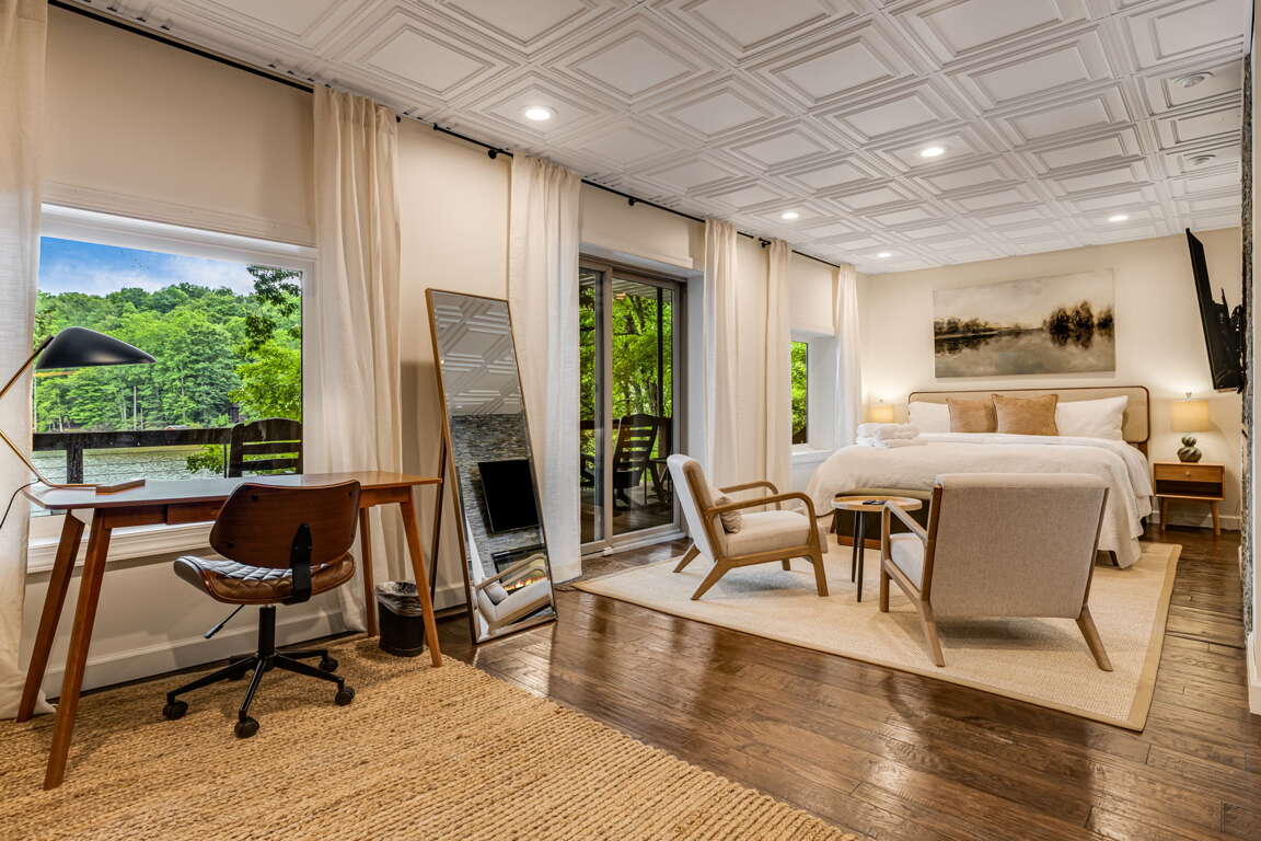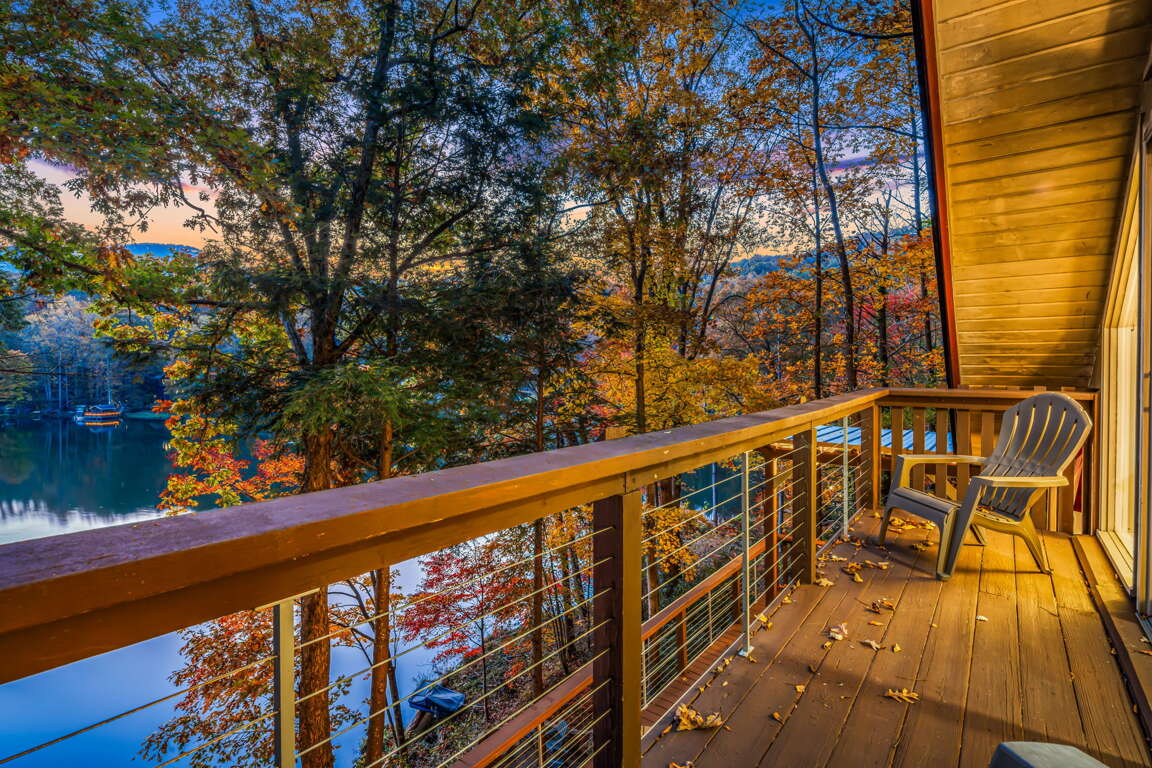 For an exceptional North Carolina mountain lake vacation, visit Tranquility Lake House, a Rumbling Bald Resort rental home in Lake Lure, NC. This beautifully designed waterfront cabin is a historic property that has retained its dreamy details during restoration, including lofty beamed ceilings, a cozy wood-burning fireplace, and multiple levels of decking with awe-inspiring views. Inside, you will discover a light, minimalist aesthetic that immediately makes you feel at home after a day of adventures. Enjoy the fully equipped kitchen for anything from a quick lunch to a family-style dinner, or seize the chance to grill burgers with a million-dollar view. The screened porch is perfect for summertime dining and offers a versatile space for spending time outdoors in any season. Designed for quiet moments, Tranquility Lake House offers bedrooms on all three levels. The primary suite occupies its own floor with walkout access to a rocking chair and lake vista below. Upper-level bedrooms both include private balconies for a breath of fresh air, while a bunk room on the main level is ideal for groups traveling with children.
