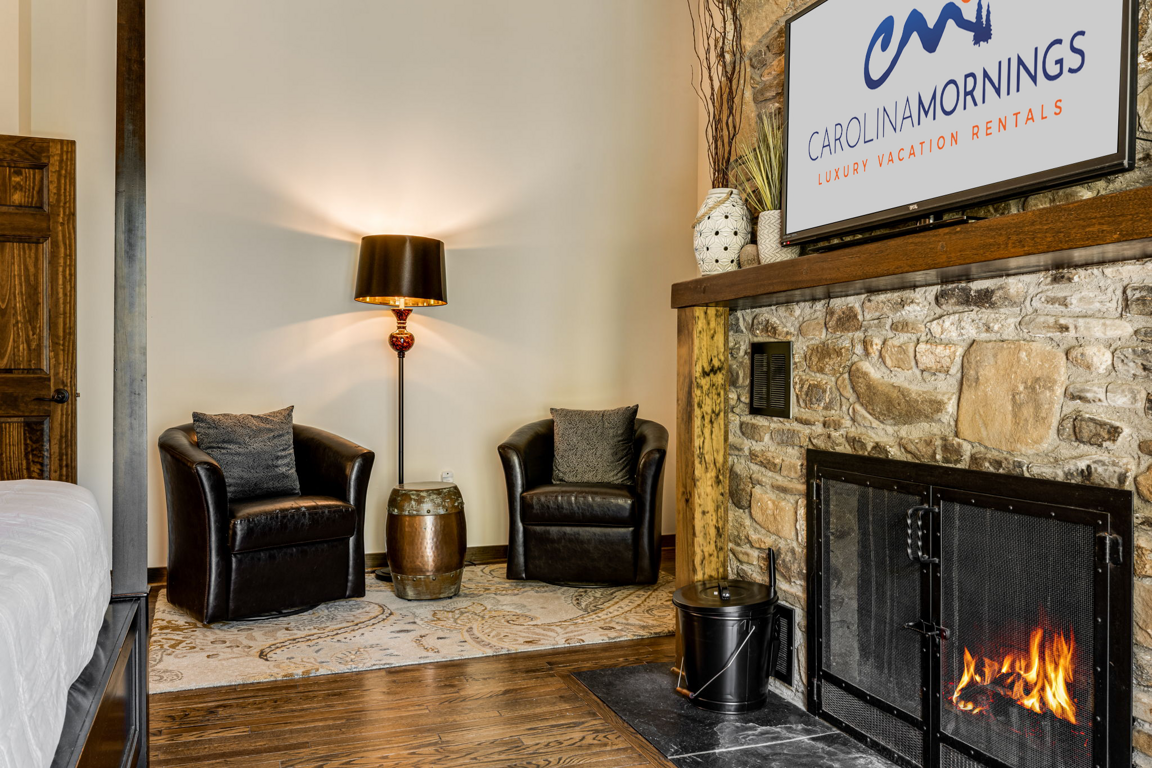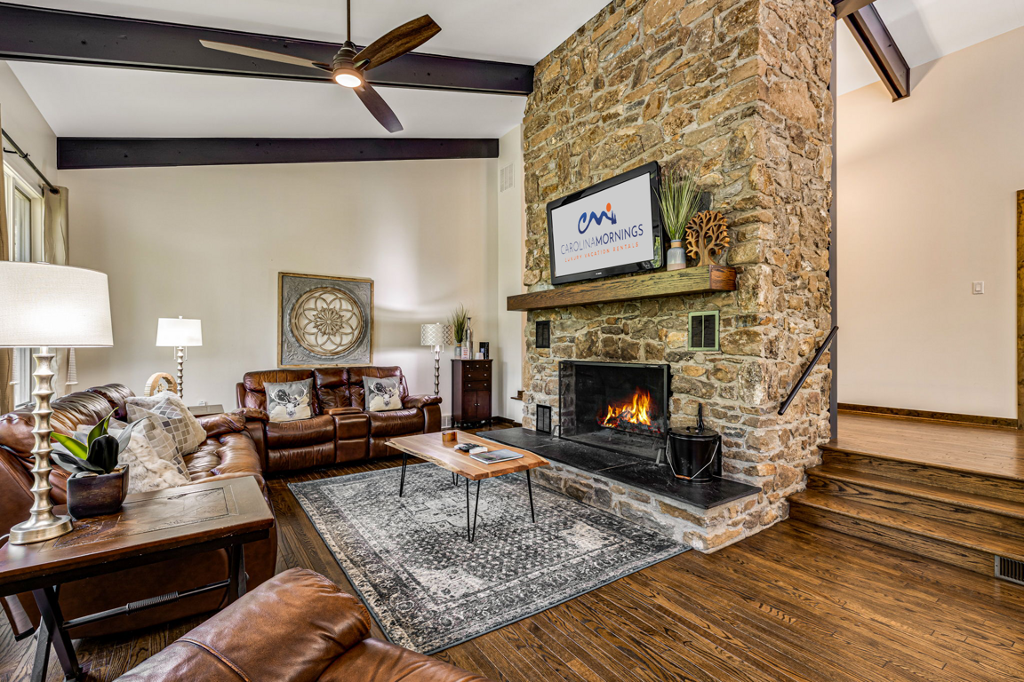 Just ten miles east of Asheville, North Carolina, Wildheart Sanctuary is a private mountain retreat featuring a beautifully updated single-level main lodge and a neighboring hundred-year-old log cabin, both surrounded by mature forest. Guests may encounter deer and turkeys wandering through the yard, offering a peaceful connection with nature. The main lodge offers single-level living with a sunken living room centered around a soaring stone fireplace, a spacious dining area filled with natural light, and a gourmet kitchen ideal for entertaining. Five bedrooms, each with a television, and three full bathrooms provide ample accommodations for families and groups. The primary suite includes a king-size bed, a natural rock hearth fireplace, and a deep soaking tub. Recreation abounds in the adjacent game room with automatic garage doors, foosball, ping-pong, and card tables, along with an outdoor lawn area for cornhole. Just outside, guests will enjoy a sunken hot tub, a luxury fire pit with seating, and a hammock set beneath the trees for peaceful afternoon lounging.