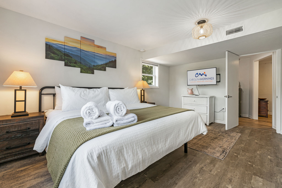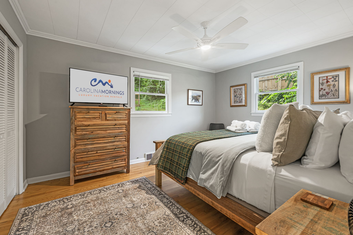 Mountain View Cottage offers plenty of room for restful nights, featuring three bedrooms, including a lower-level suite with walkout access to the driveway. The back deck, complete with a gas grill and outdoor dining table, overlooks a private fenced yard where children and dogs can play safely. In the evening, gather around the fire pit to enjoy local brews under the stars. For a leisurely stroll or jog, explore the neighborhood roads, or take a short five-mile trip to Lake Junaluska, which offers a scenic lakeside trail, a playground, and free public tennis and pickleball courts. At Mountain View Cottage, you will experience the warmth of small-town living with all the best attractions of the Smoky Mountains within easy reach.