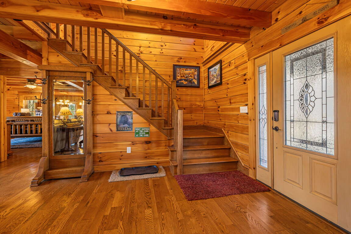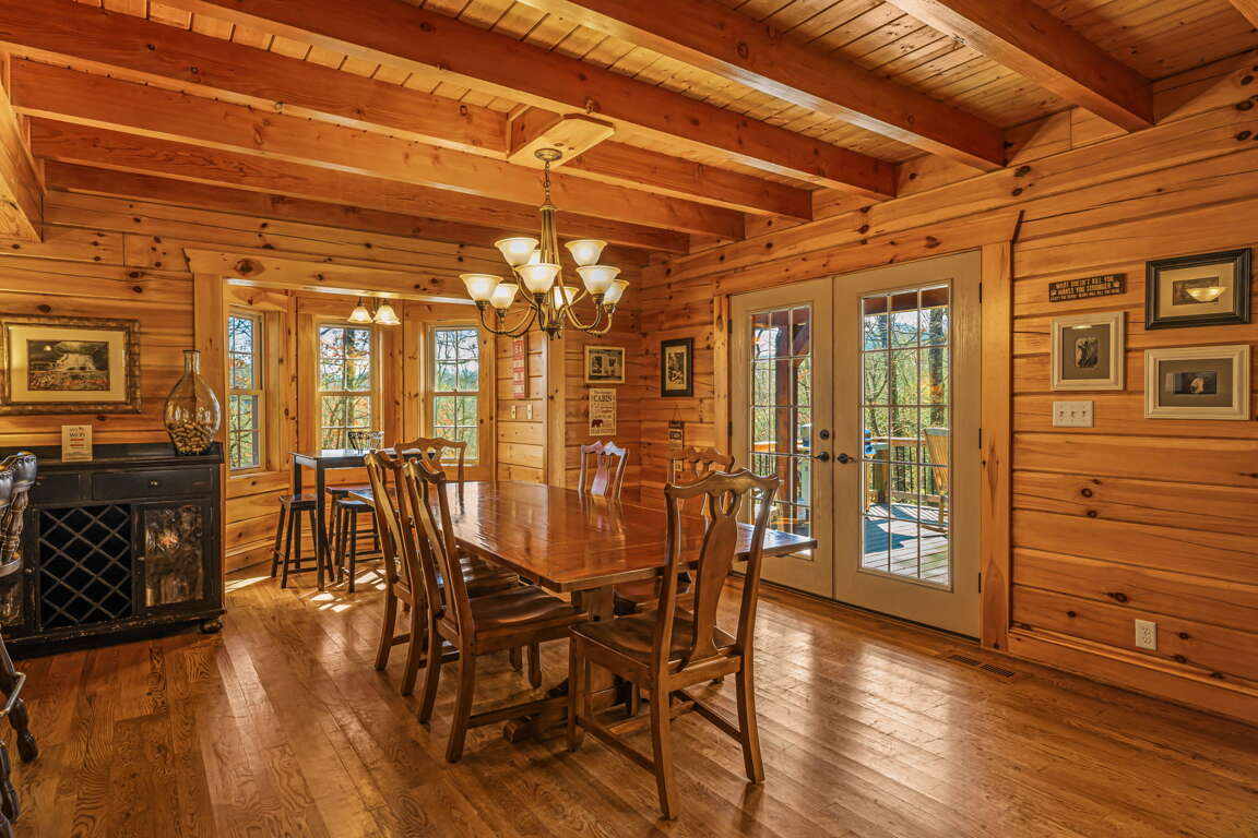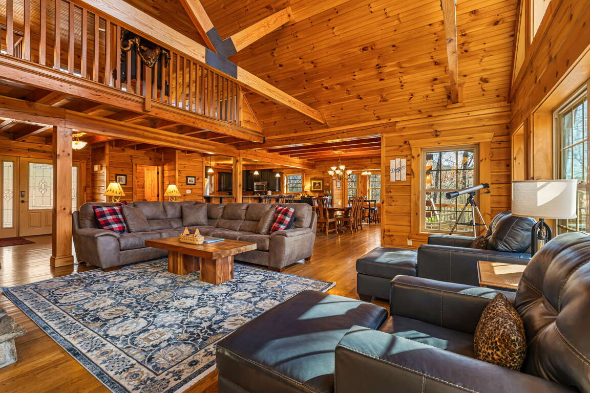 Wildcat Lodge offers an exceptional Black Mountain log cabin experience. Follow the winding road from Black Mountain, North Carolina, to the archway and entrance gate of Catawba Falls Preserve, a 900-acre mountain community that borders Pisgah National Forest. This Appalachian retreat offers year-round paved access and on-site trails leading to Catawba Falls and Hemlock Falls. Designed for memorable gatherings, the home features a hot tub, a game room, and five bedrooms arranged across three levels (each with en suite bathrooms), making it ideal for multiple families traveling together. With modern amenities blended into a classic log-frame design, this classic cabin becomes especially inviting in the evening as a wood fire crackles in the stone hearth. Guests may prepare favorite meals in the gourmet kitchen or pass the apron to the groups grillmaster.