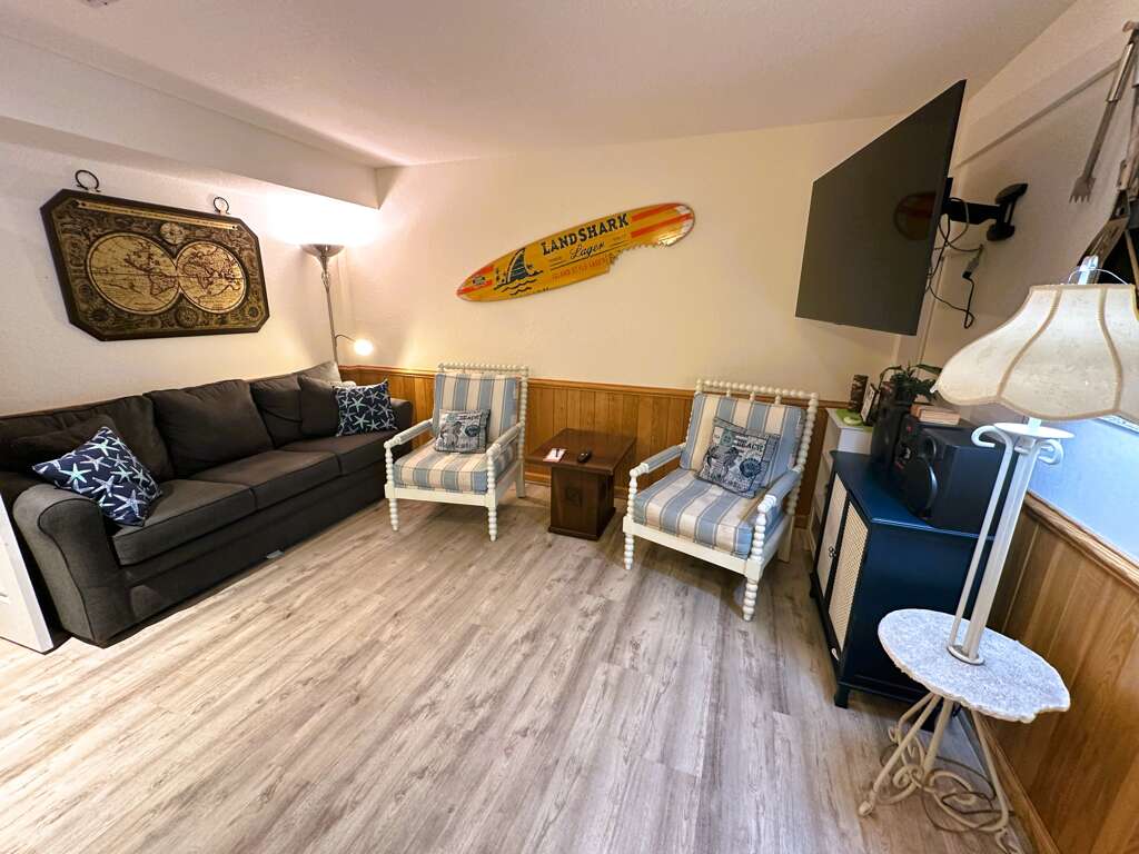 Rec Room with Pool Table, Wet Bar, Mini Fridge, Microwave, Coffee Machine, Couch & Chairs with a T.V.