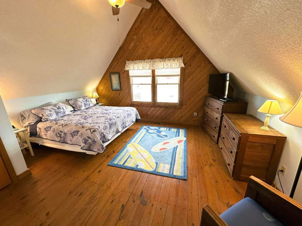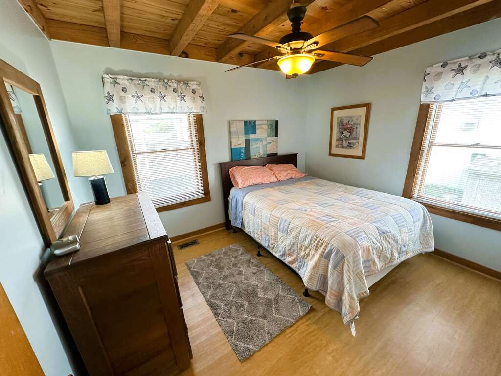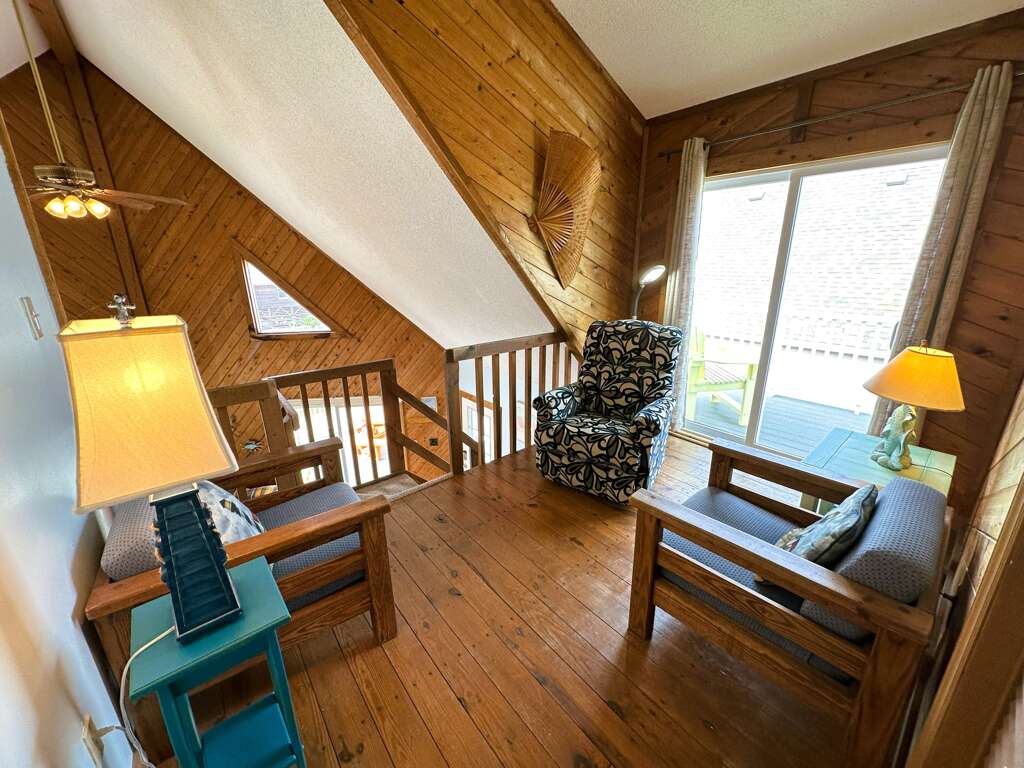 A stunning master suite with a king size bed, ceiling fan, TV and full bath. The master bath has a tub and shower. There is also a private sitting area with easy sun deck access where you may enjoy the views of the Wright Brothers Memorial.
