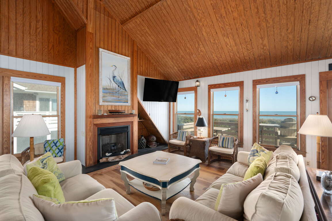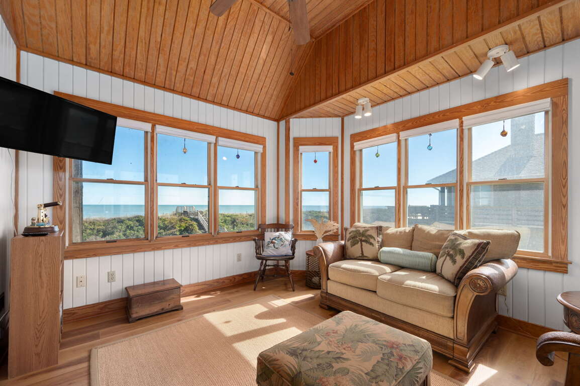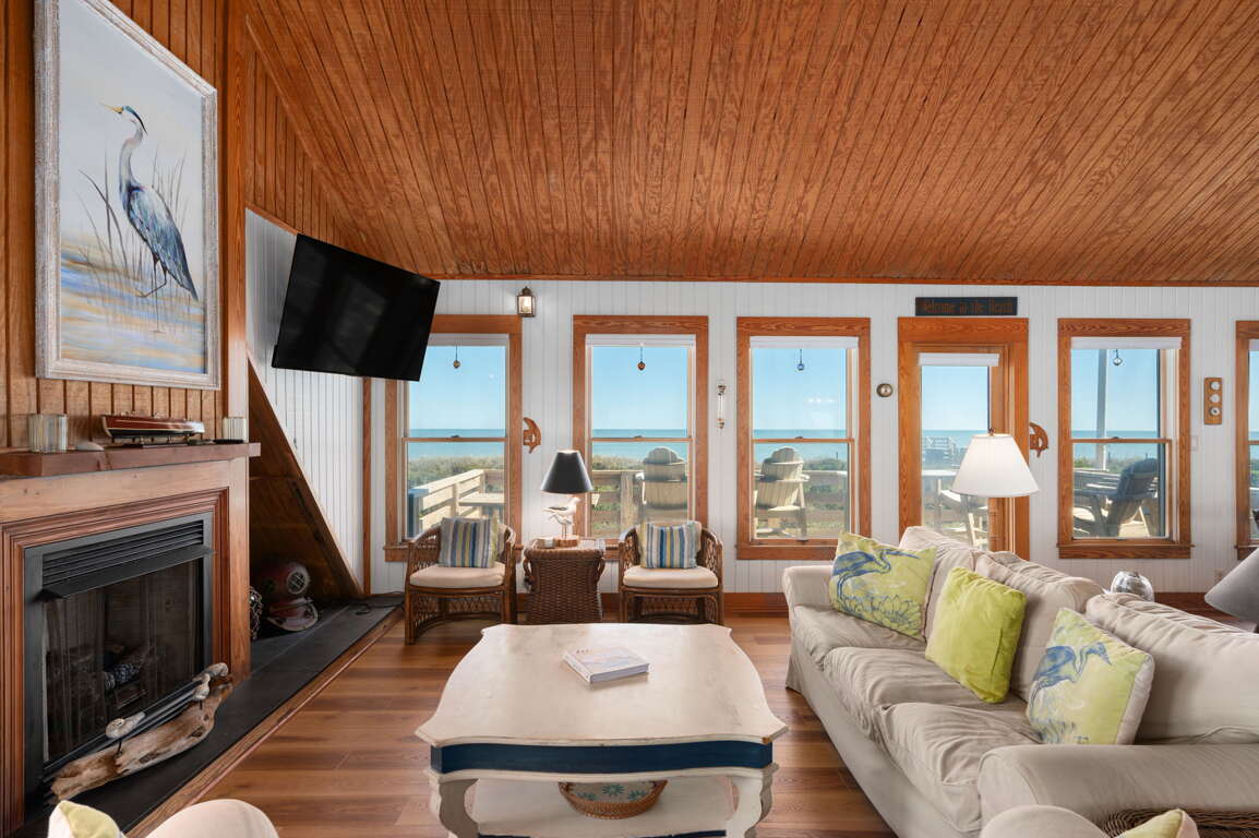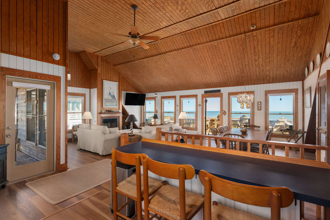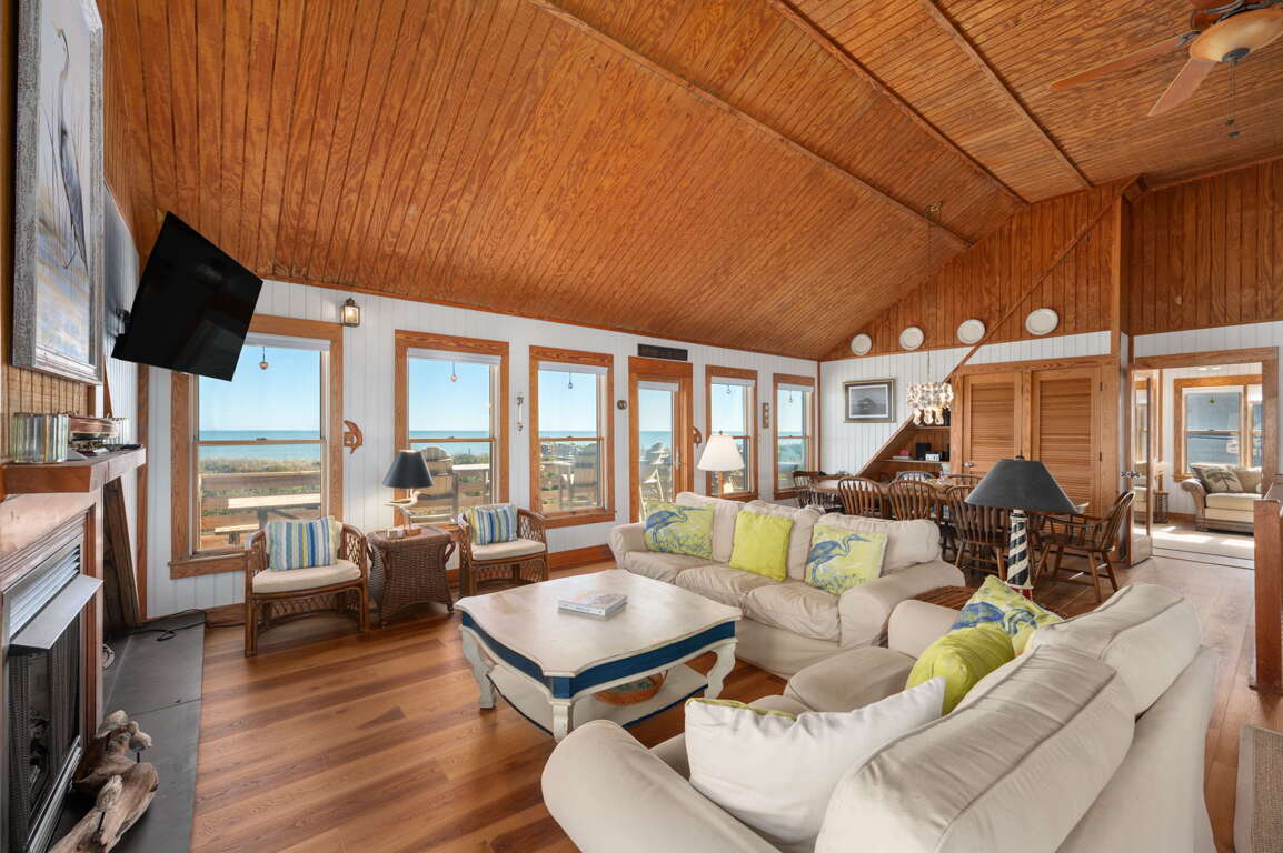 The living room has a large flat screen television, VCR, DVD, ceiling fan, and access to a huge oceanfront deck looking over the Atlantic Ocean.