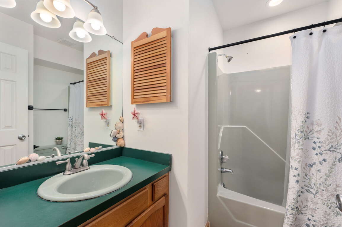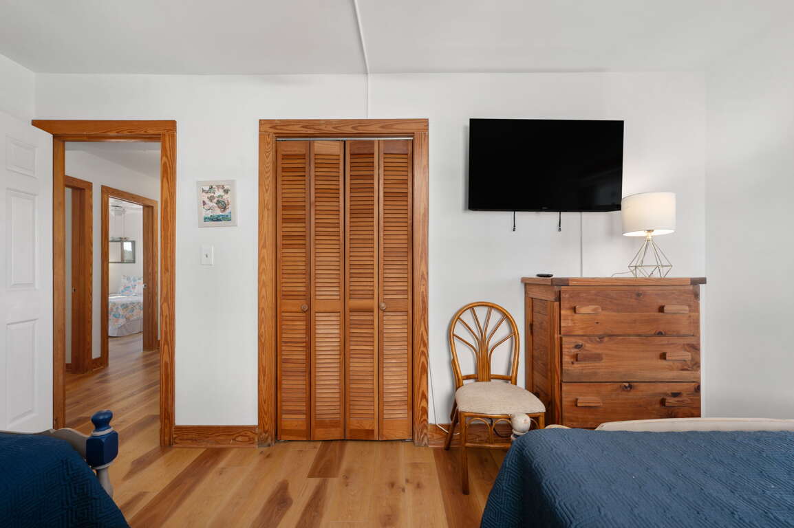 The next bedroom is a Master suite with a king bed, ceiling fan, television and private deck access. The bathroom also connects to the hall and has a tub/shower combination.