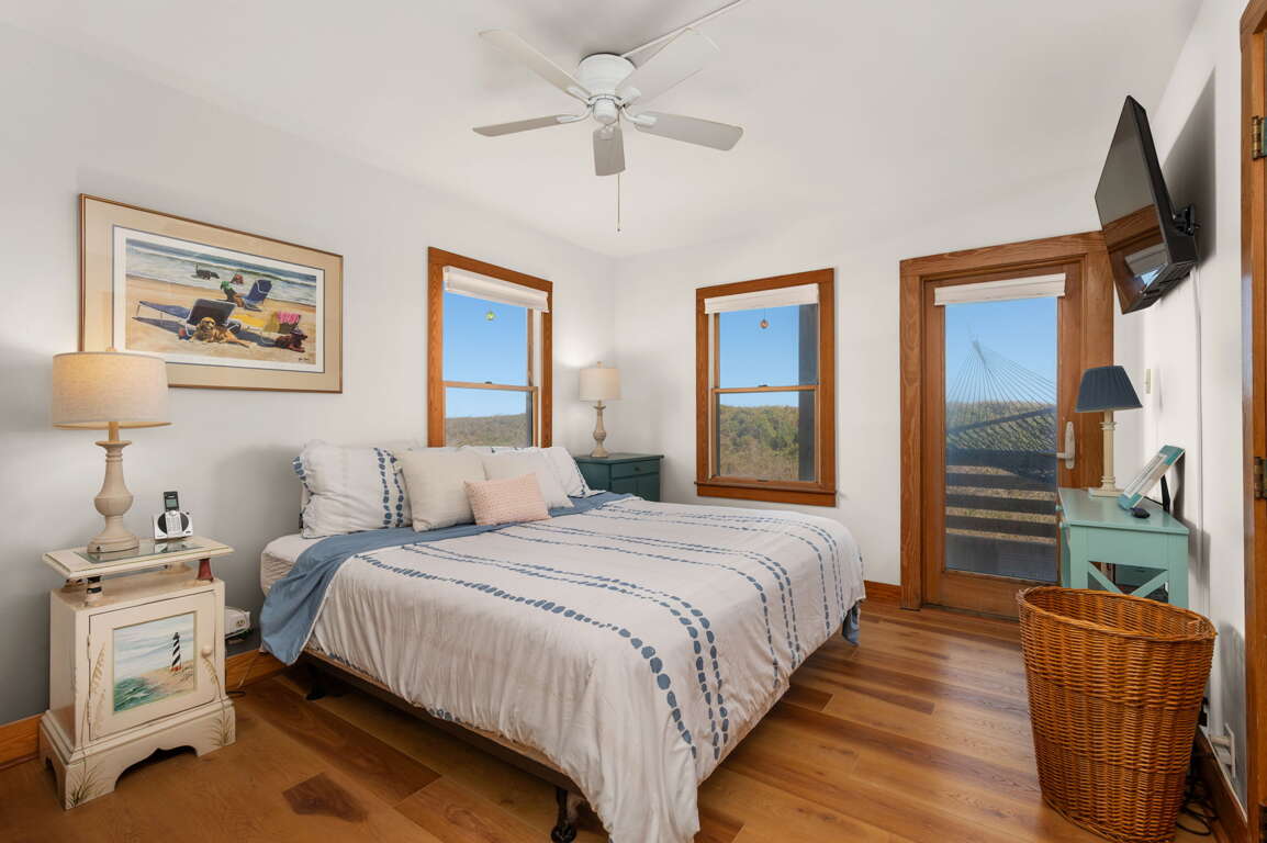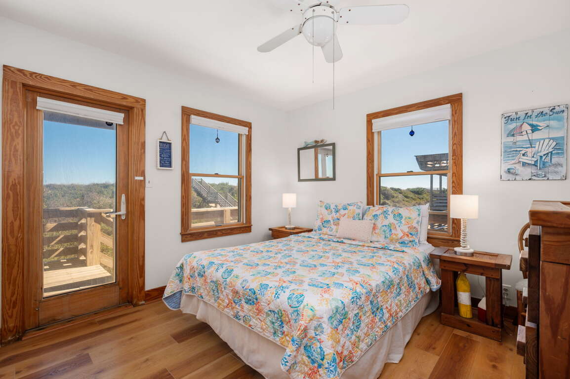 There is a bedroom with a Queen bed that has beautiful ocean views, a ceiling fan, and private deck access.