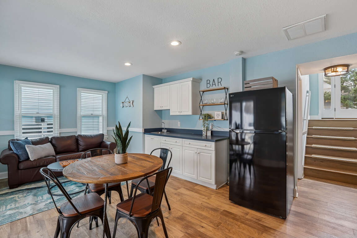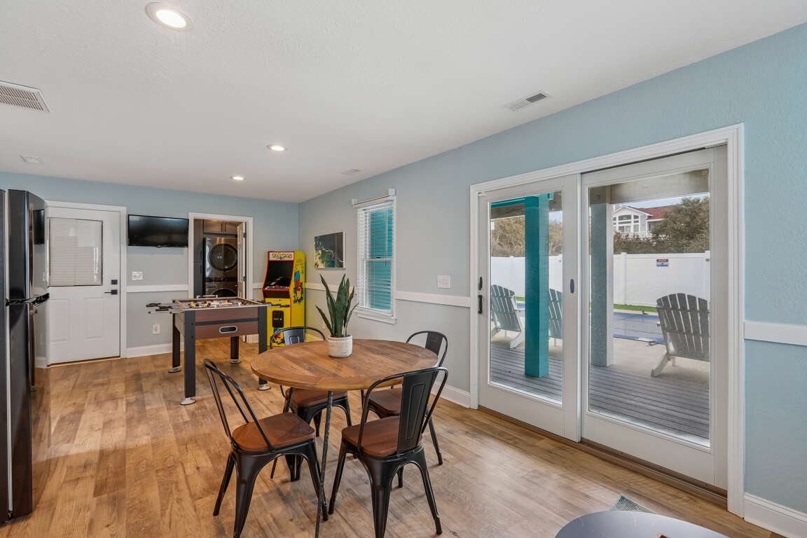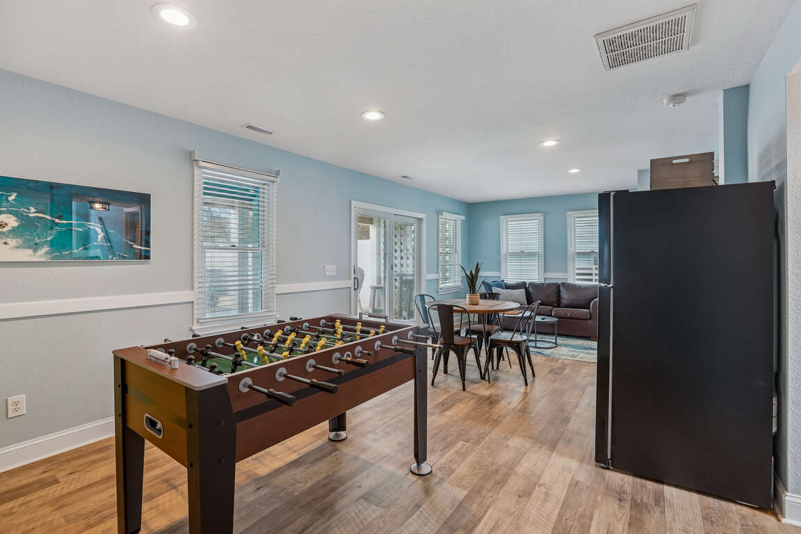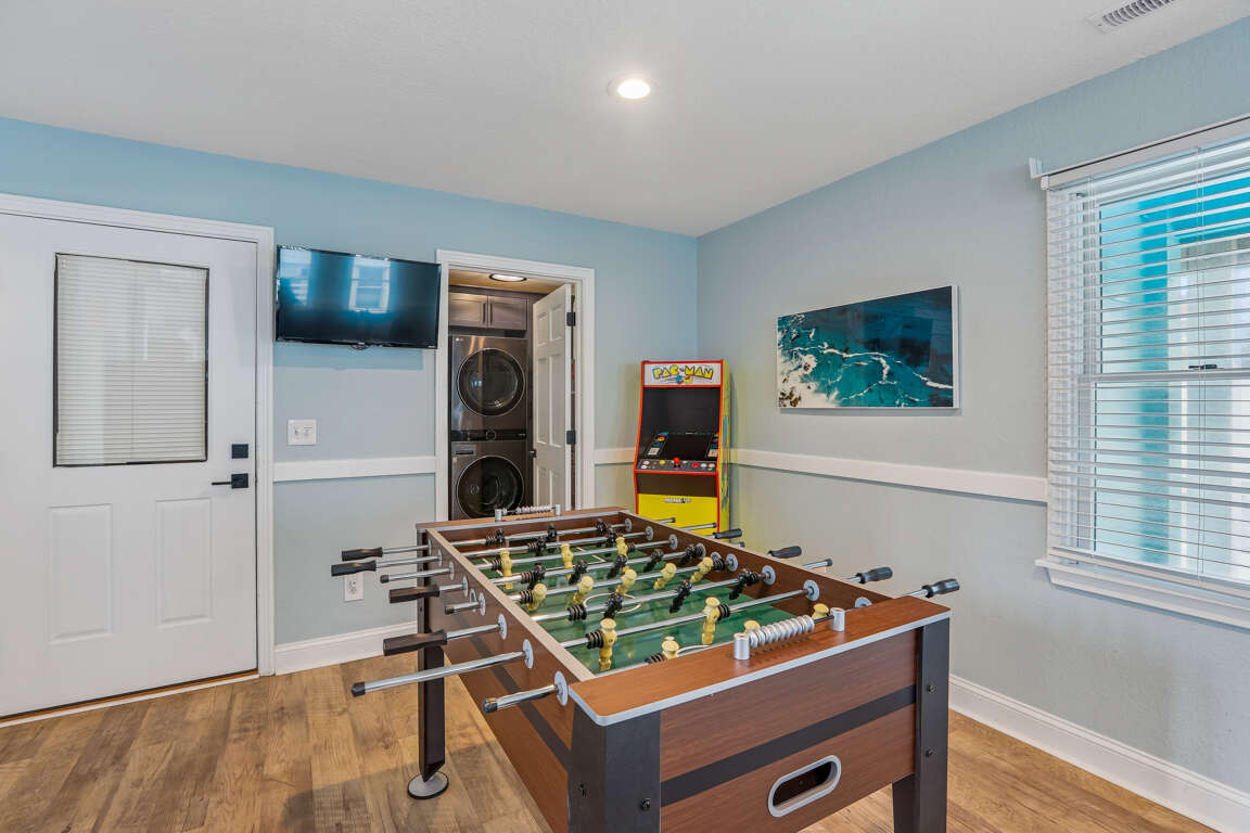 Recreation Room with full-sized refrigerator, wet bar, Pac-Man arcade, and Foosball table.
