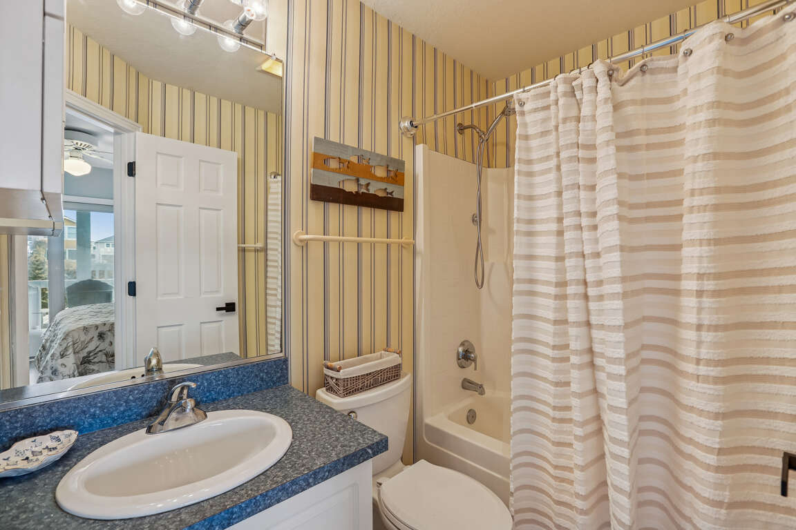 Full bathroom with tub and shower combo.