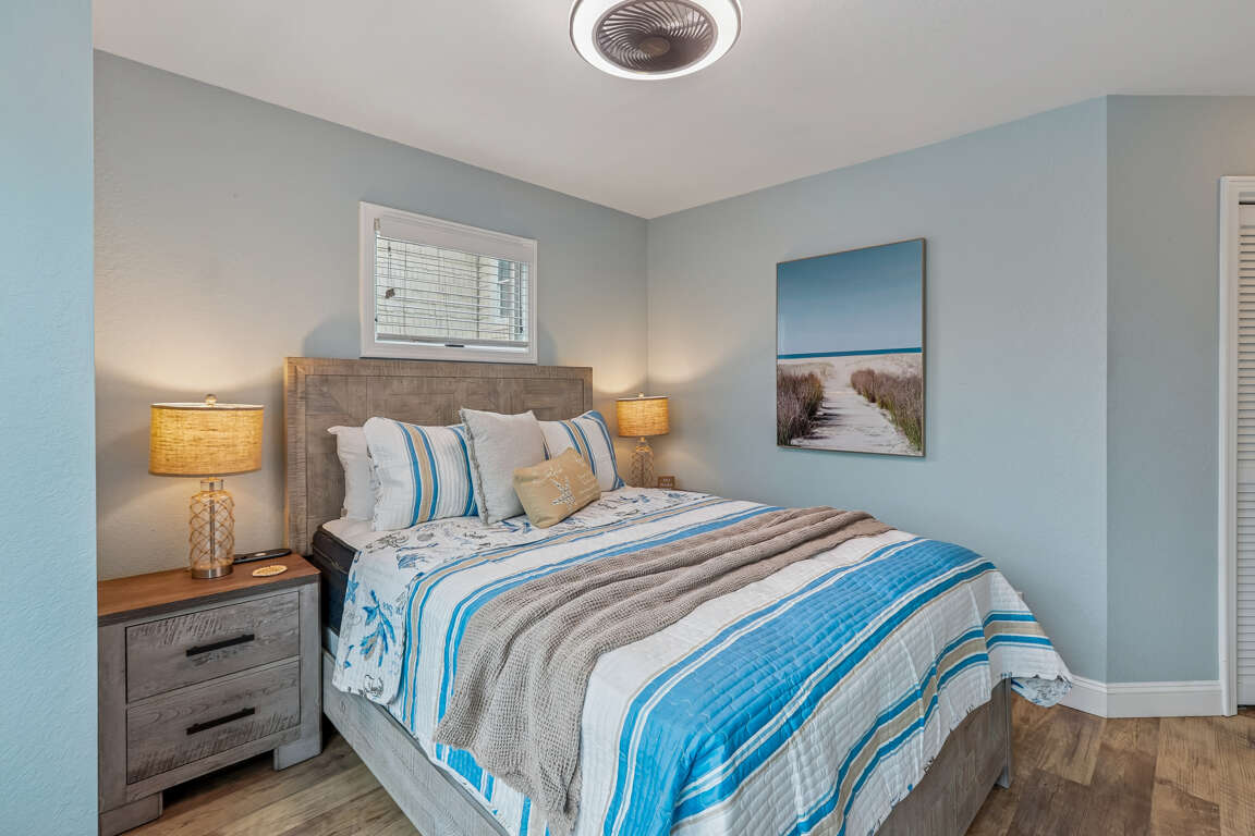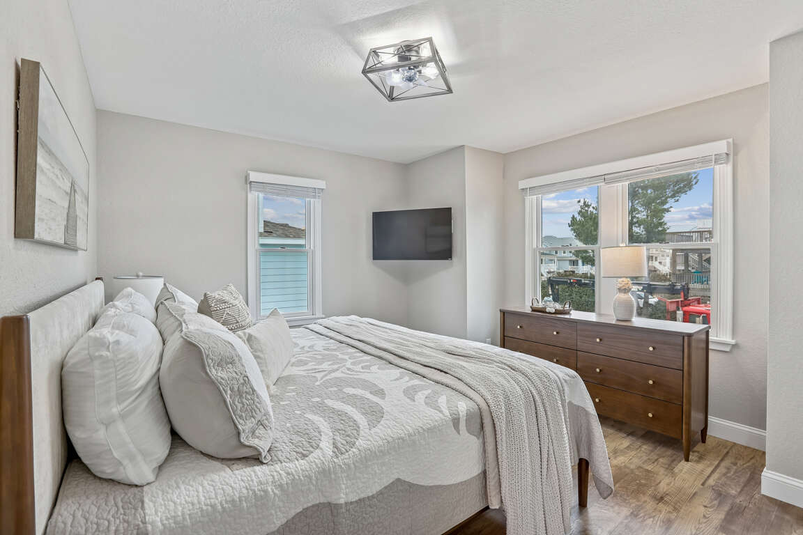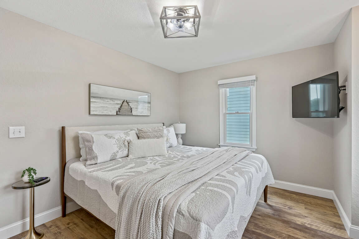 Bedroom with King Bed, television and ceiling fan.