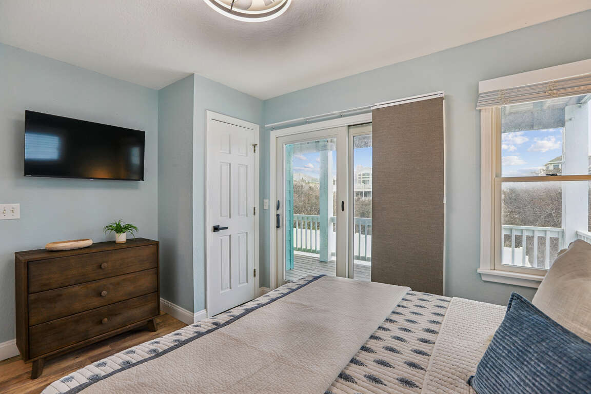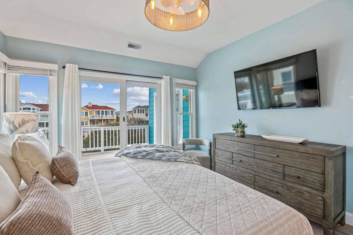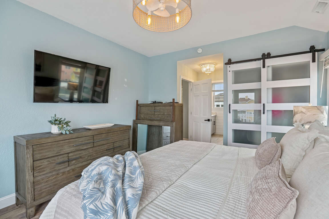 Master Queen bedroom with full bathroom, television, ceiling fan, and private deck access overlooking the private pool.