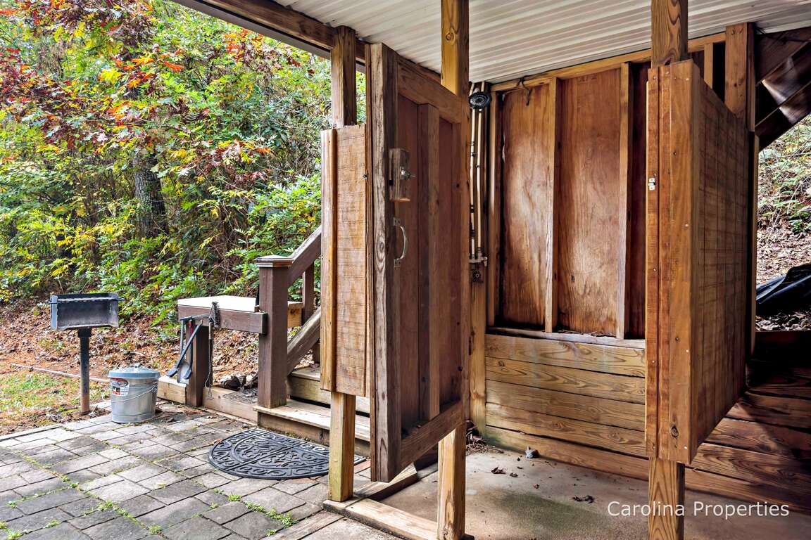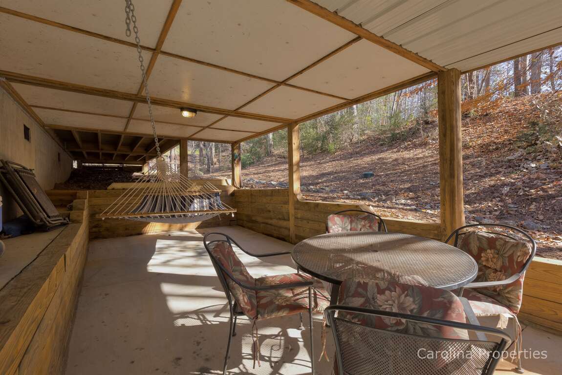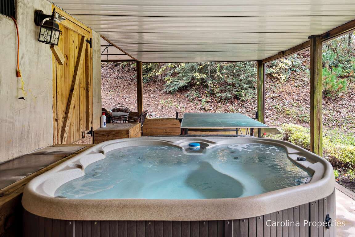 Walk in front of the home and around to the other side of the deck to descend the stairs, and you will reach the lower covered patio area. This space is equipped with an outdoor shower, a two-person swing, a large hot tub, a hammock, seating for 4, and a ping pong table. There is also an additional uncovered patio area with a built-in charcoal grill.