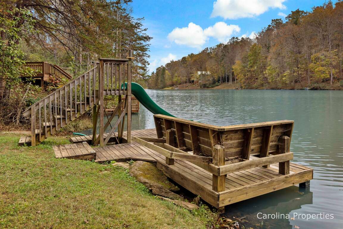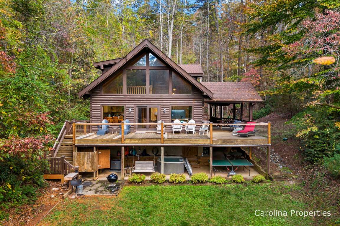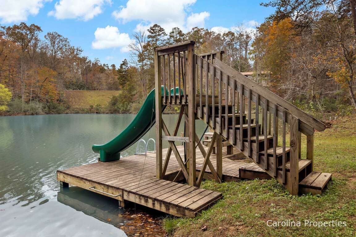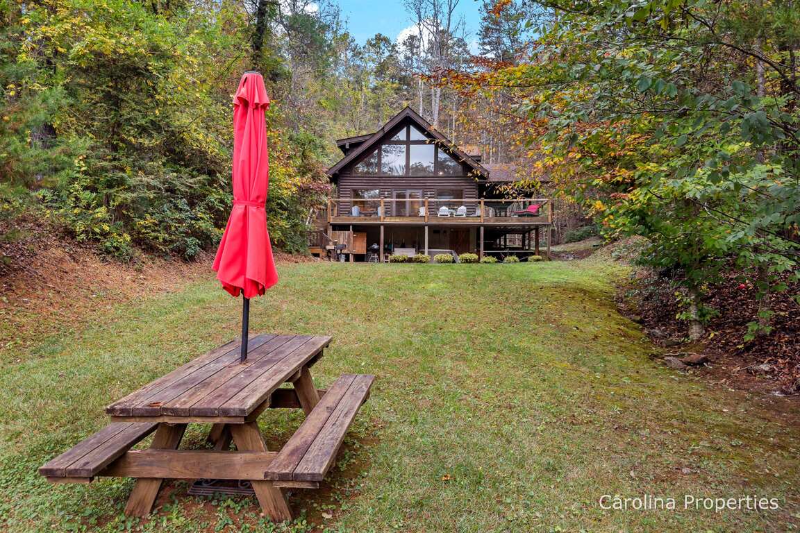 This home is unique in that it has a fabulous flat grassy yard in a gorgeous setting, day and night. The night sky offers a breathtaking view of the stars. Down by the lake is a canoe, three kayaks, a water slide that will take you directly into the lake, a ladder to climb in or out of the lake, and a very nice wooden bench seating 6-7 people. The yard is fabulous because even in the winter, it is predominantly grassy. The young or the young-at-heart will love playing in the yard here. Back to this home's deck is a bench swing, a sturdy rustic picnic table, and additional seating for 5. It's very nice with plenty of places to gather with friends and family or find solace on your own.