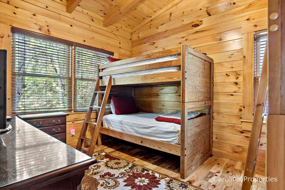 From the living room, ascend the stairs to the loft, where you will find a unique foosball/coffee table that is fun yet tasteful. The loft offers seating for four, with a futon sofa that can be turned into a bed. Enjoy the lake view from the two bedrooms and the full bathroom on the upper level. One bedroom has two sets of twin bunk beds and a television. The other bedroom is quite spacious, with a queen-sized bed and a television.