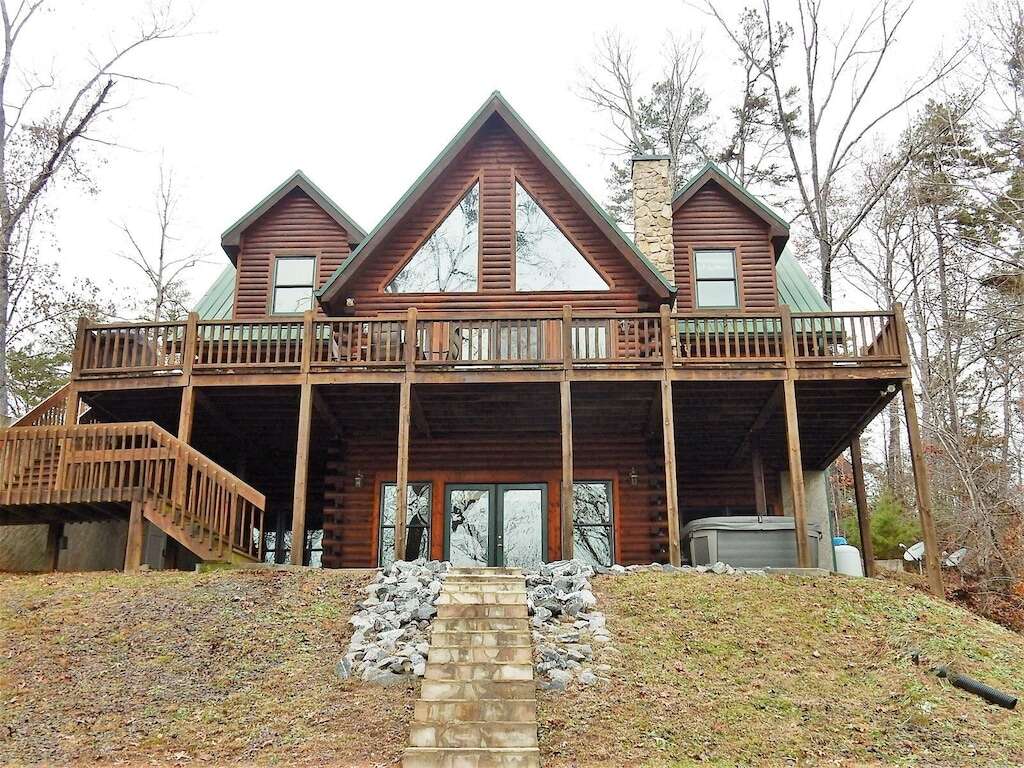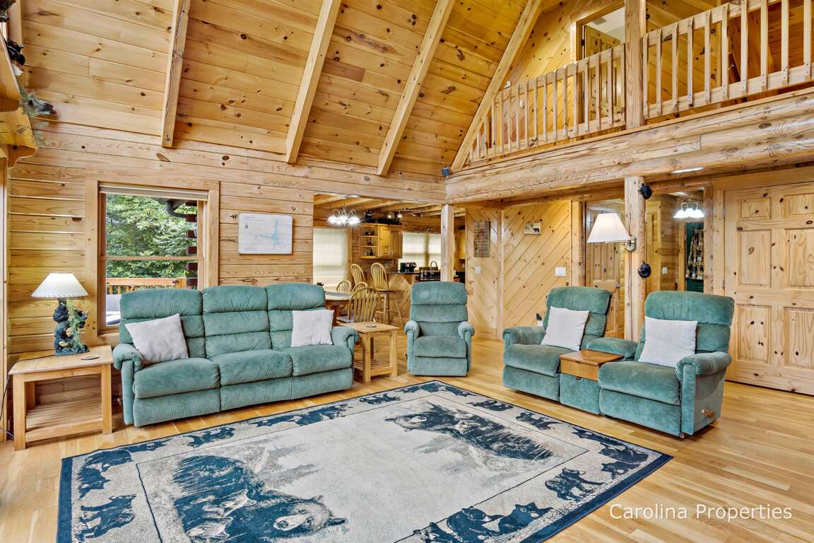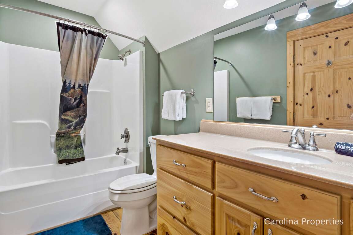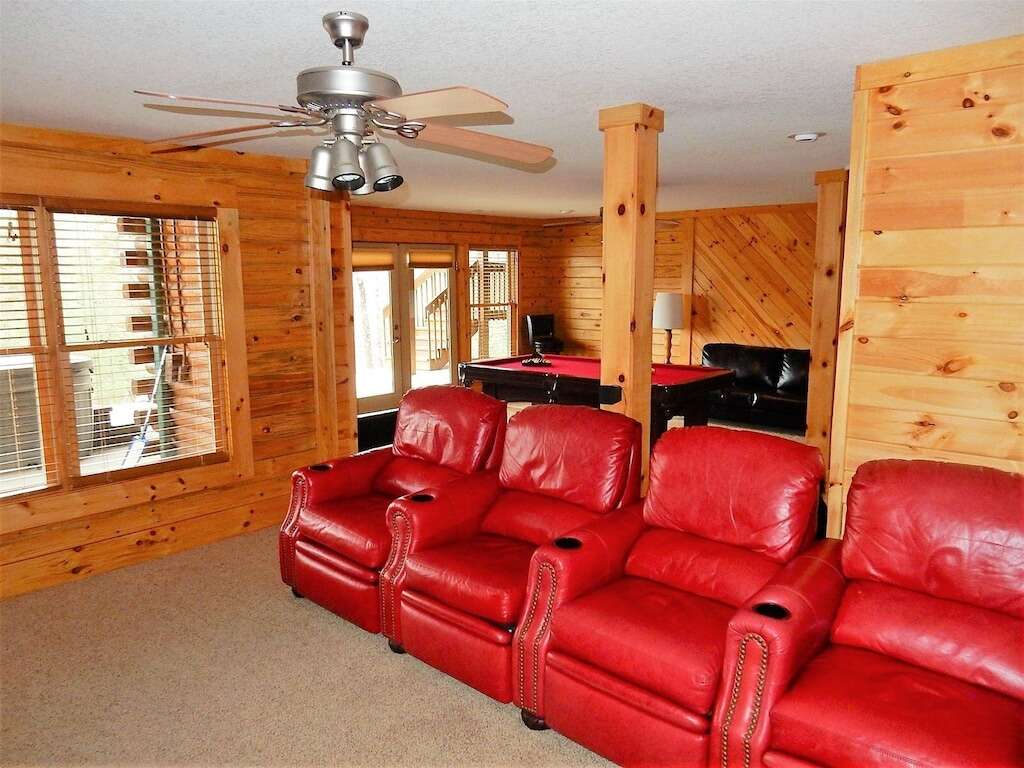 Appalachian Sunrise offers a great room with a cathedral ceiling, a gas log fireplace, Wi-Fi, a DVD/Blu-ray player, a flat-screen TV with surround sound, and a DirecTV basic package. The dining room seats 6, and there is a breakfast island with 2 additional seats. This property offers a well-appointed, stocked kitchen. The main level features a master bedroom with a king bed, flat-screen TV, French doors to the deck, a walk-in shower, and a laundry area. There is a half bath in the hall. Upstairs, you’ll find a loft overlooking the great room; additionally, a guest bedroom with a King bed and a second guest bedroom with a queen bed and 2 twin beds, plus a full shared bathroom. A lower-level family and the game room come with a pool table, 70″ flat-screen TV with DirecTV, beer/wine refrigerator, and patio area. There is a lower-level bedroom with 2 twin beds and a full bath.