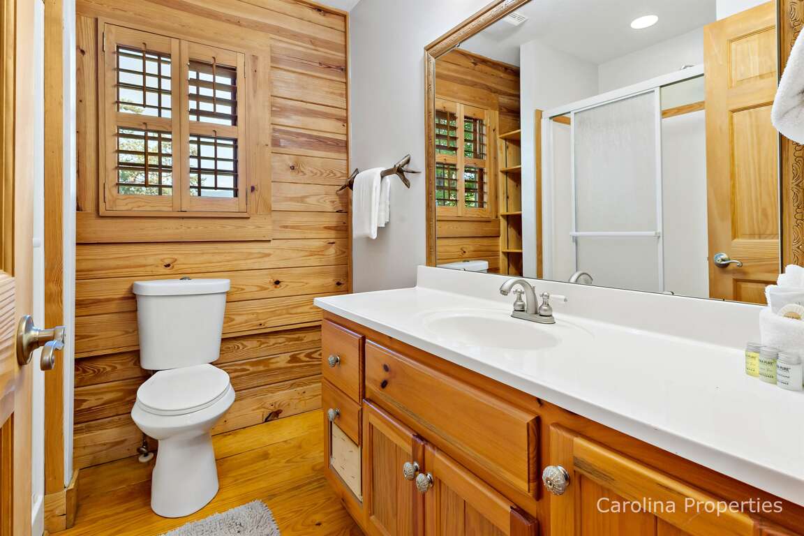 Bathrooms: There is one bathroom on the main level, and it is accessible from both the kitchen and the main-level master. It has a single walk-in shower, a double vanity, and a standard bathtub. The upper-level bathroom is inside the upper-level master bedroom. It has a single vanity, a walk-in shower, a lake, and a mountain view. The lower level has a bathroom with a single stand-up shower for the two lower-level bedrooms to share.