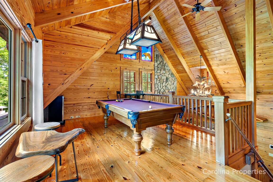 In the loft, you’ll find the pool table, beverage fridge, and a wall-mounted television. A small bar-height table seats two, making a nice worktable for those so inclined. The loft overlooks the living room and puts you at eye level with the living room's statement lighting. The loft has a lake and mountain view!