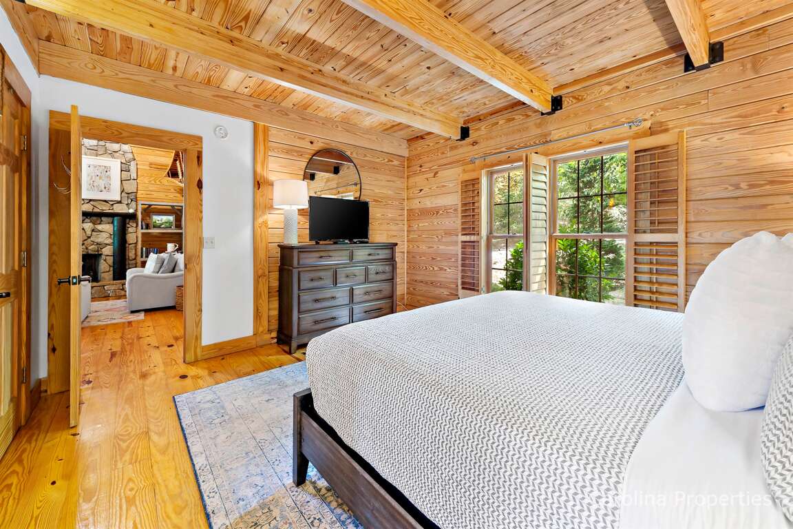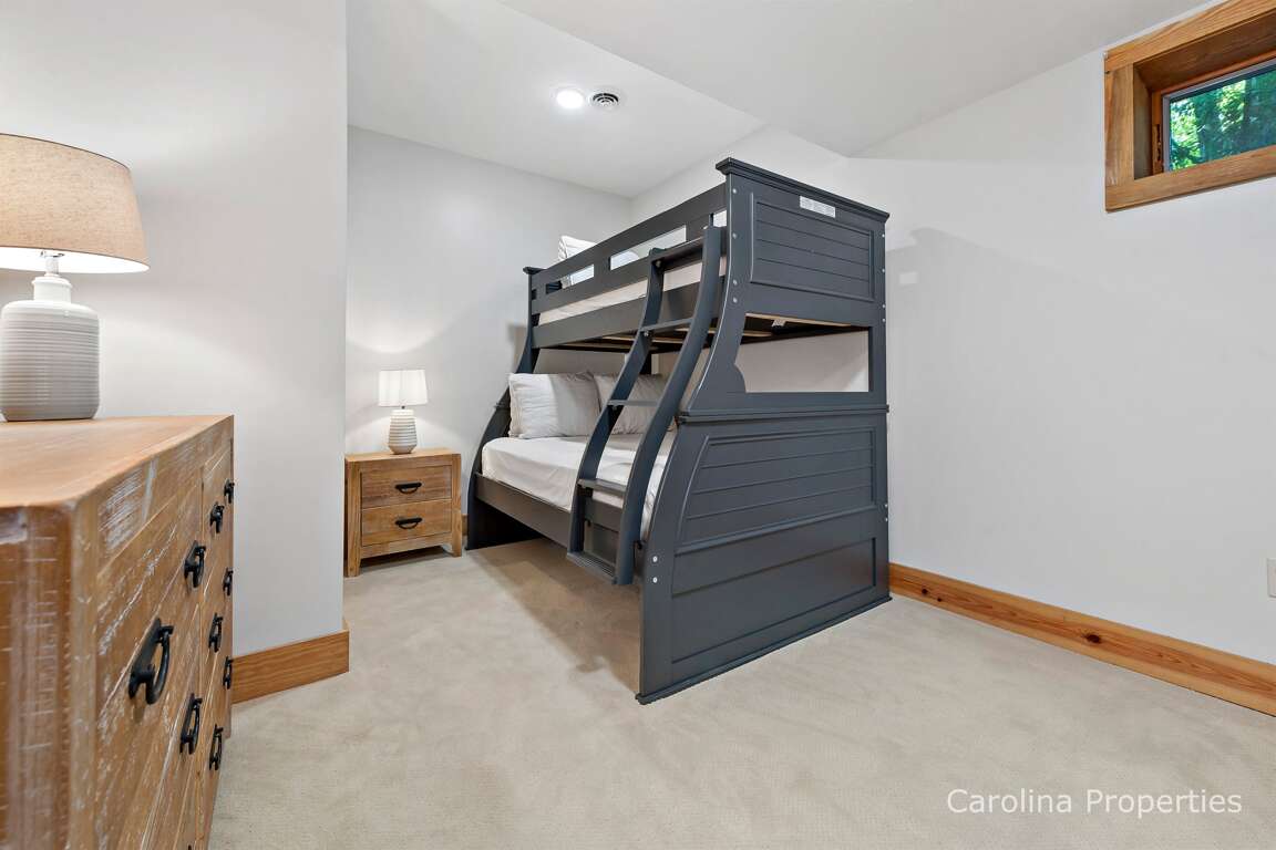 Bedrooms The main level bedroom has a plush king bed, a large walk-in closet, and a flat-screen TV. The upper level offers another master bedroom with a king bed, and luxuriously relaxing seating area, and a private bathroom. The lower level has two bedrooms, one with a twin over full bunk and a bedroom with a queen bed. The queen bedroom is accessible to the lower-level deck. The queen room has a ceiling fan, and the twin-over-full bunk room has a desk fan.