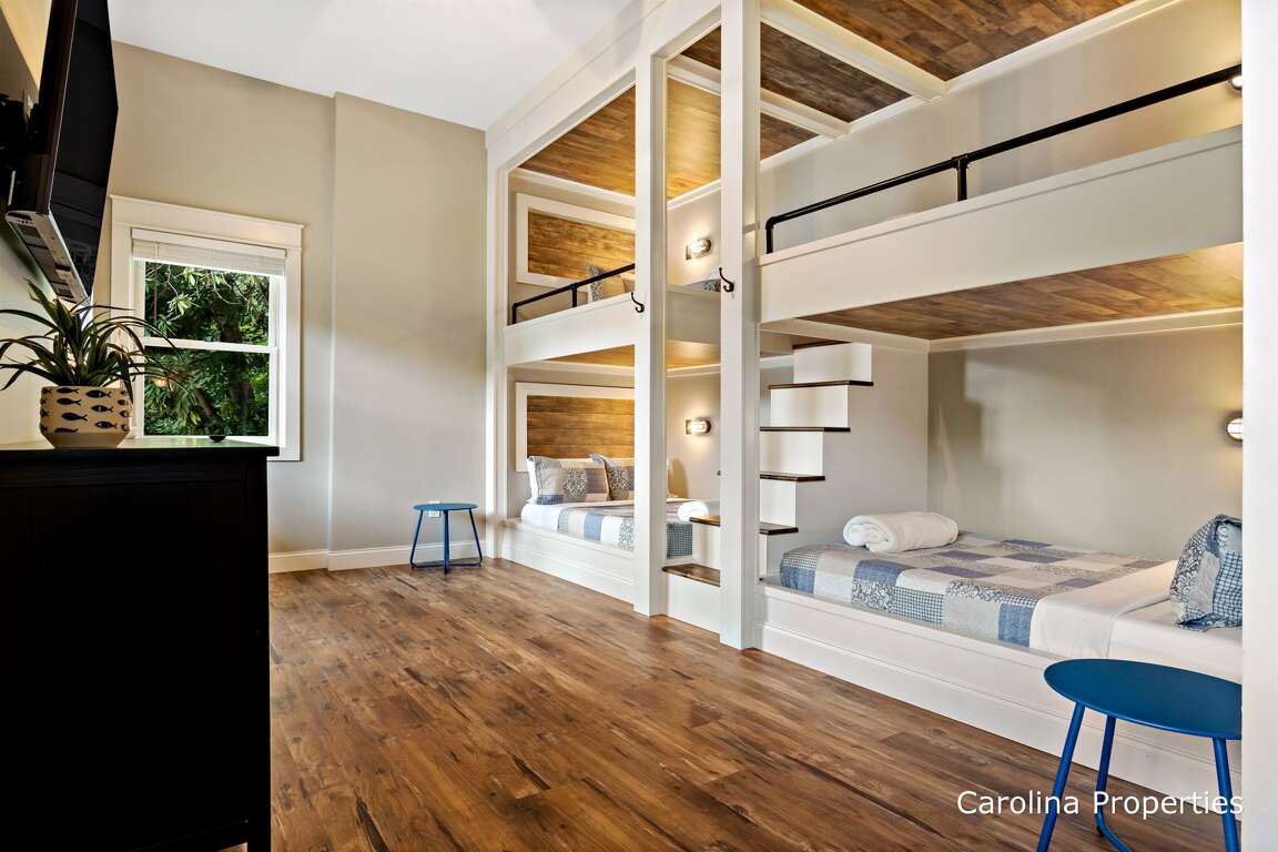 There is a king-size bed in one bedroom and two queen beds in the second bedroom. There is a full bath off the living area between the two bedrooms. The lower level offers another full bath and bedroom with two bunks, with a twin on top and a full on the bottom!