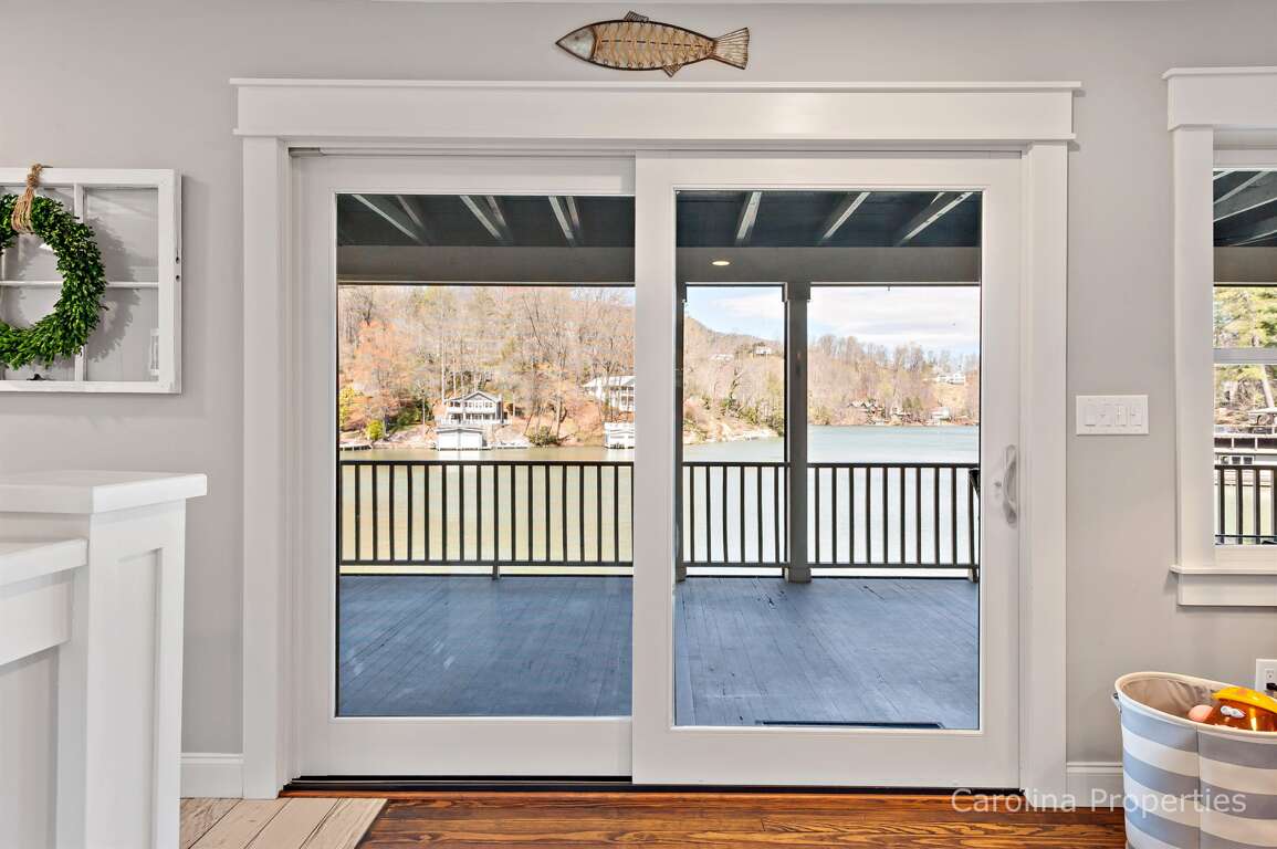 Upon entering, there is a wonderfully crisp and clean feel as you walk through a nice living area and kitchen that opens up to a large covered screened porch with a dining table and beautiful lake views!