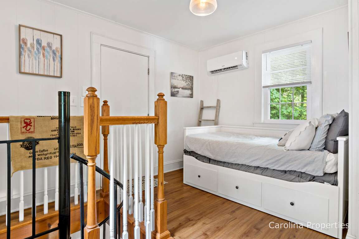 Let's go back inside and check out the house. Yes, the living room is comfortable with a pretty view and an open floor plan, and the kitchen seems perfect for cooking up some greens, beans, and cornbread while watching the sunset. Now, off to the downstairs bathroom and then upstairs. Wow, this bathroom is nice! It's been redone like the rest of the house and has a modern feel. There is a dehumidifier here; it's not because the house is moist; it's just to protect this lakefront home from too much moisture from sitting so close to the water. Don't worry, you don't have to do anything about it, and it's hushed. Let's go upstairs using the charming spiral staircase. You can also access the upstairs by going in an upper door from outside, but let's go this way this time. You might find you use it every time! The upstairs is like an adorable cottage. Who's sleeping on the daybed? Anyone? If not, I want to read a book and take a nap there! The upstairs bedroom is delightful, and the tastefully remodeled modern half bathroom can be accessed from both the day bed sleeping area and the bedroom. Enjoy your stay, and don't forget to add something to the guest journal!