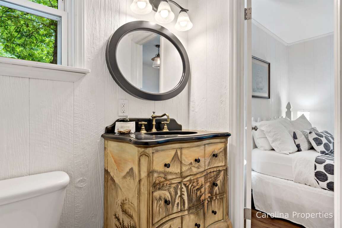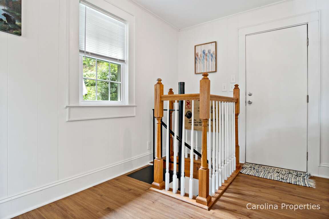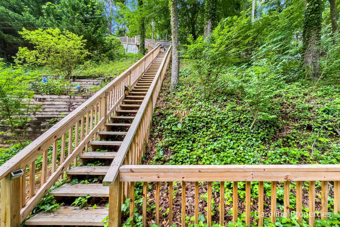 Wow! That was a lot of stairs, but you made it, and now look what a sweet cottage you are in right on the water! Before making the beds and putting out the towels, let's look around. Look at that view! Let's walk through the kitchen and the living room to go out the back door - everyone wants to see the lake. I love looking at it from the kitchen and living room windows, but it will be even better out here. Look at the single chair sitting beneath the trees overlooking the lake; it reminds me of the perfect place for the strong, silent type to sit or the one who likes their coffee with a spoonful of reflection. What a cozy fire pit and little cove - there's not much privacy, but this is cute and comfortable! A great place to stay when you have activities planned, such as coming to town for a wedding, trail riding at a local stable, hiking, or going to Biltmore. You will get a workout with the stairs, but who doesn't need a little heart health and muscle building? Get that circulation moving! Did you rent a boat or plan on using the kayaks that are provided? This place is also perfect for those who want a lot of lake time adventure!