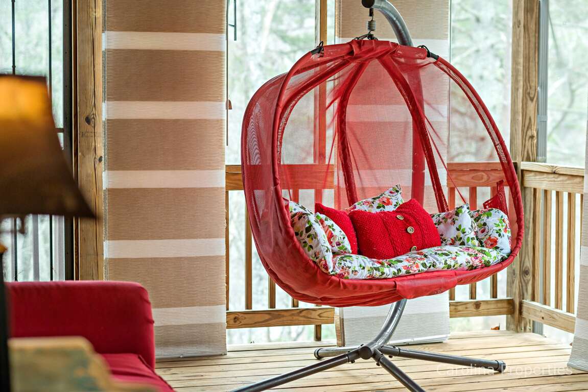 The spacious porch features loads of charm, ample seating, a gate for child safety, and a locking door for feeling completely secure during those impromptu dozing sessions. The expansive open deck is terrific for appreciating the great outdoors during the milder months, which is most of the year! The secluded cabin in the woods sits on 3 acres of land so that you can enjoy your private, relaxing vacation.