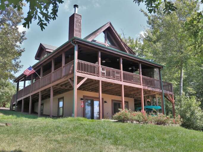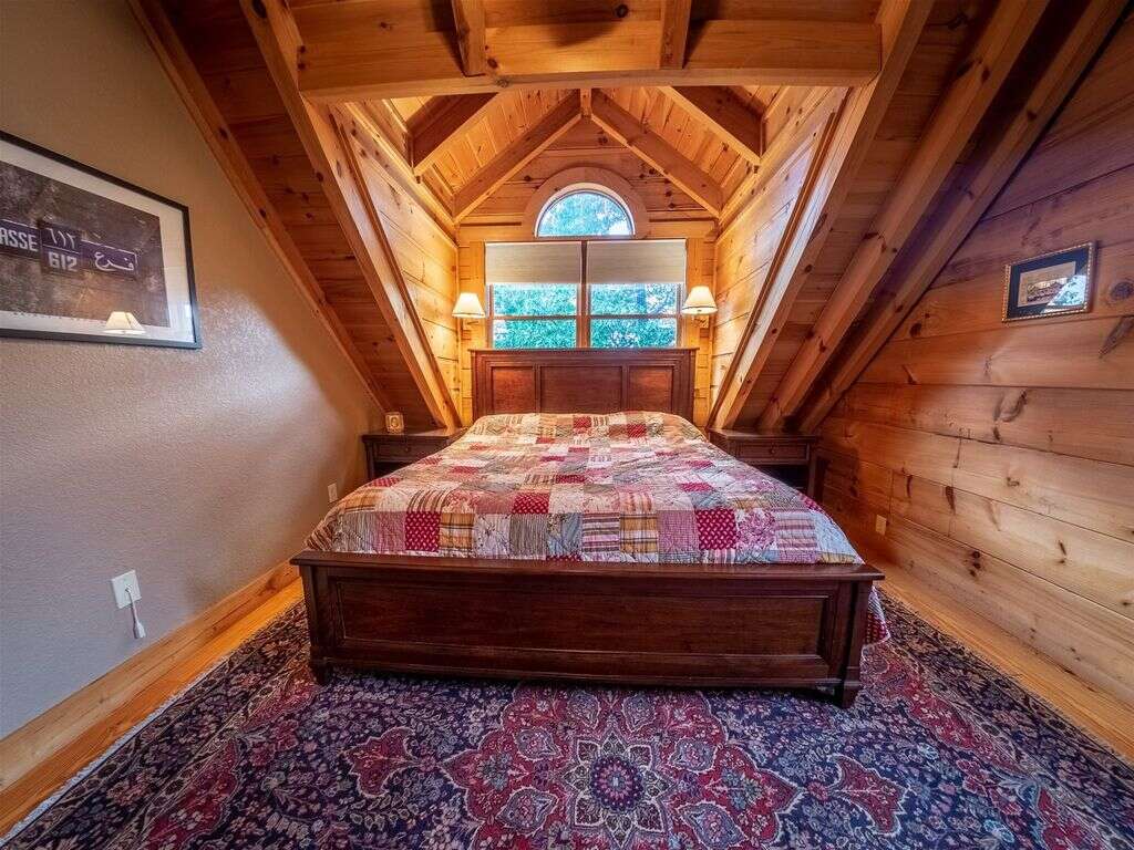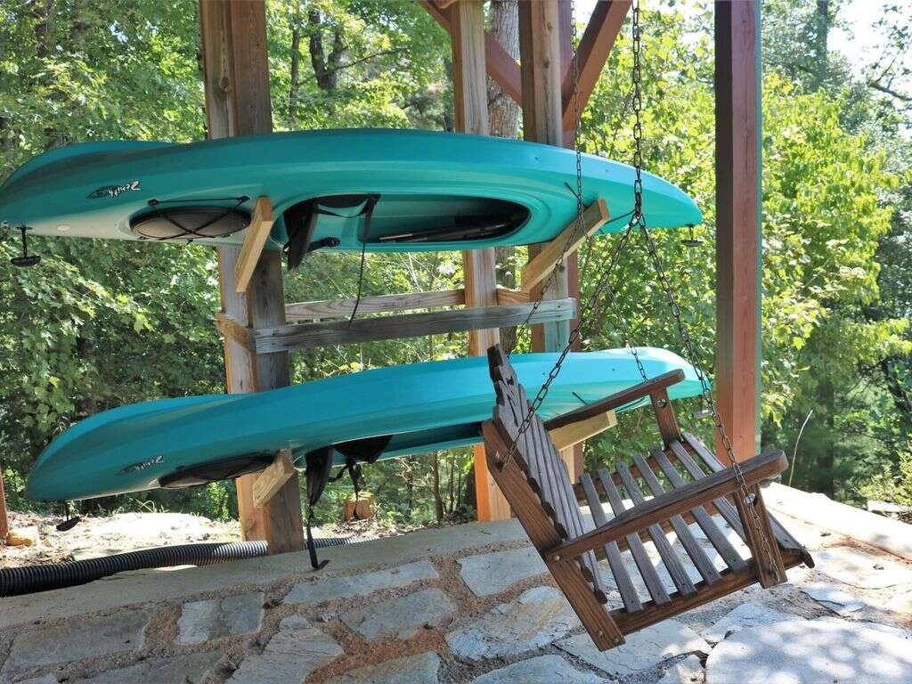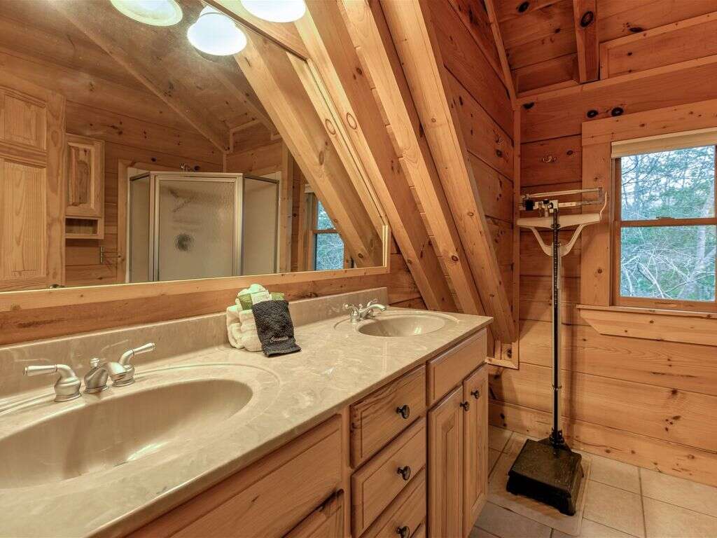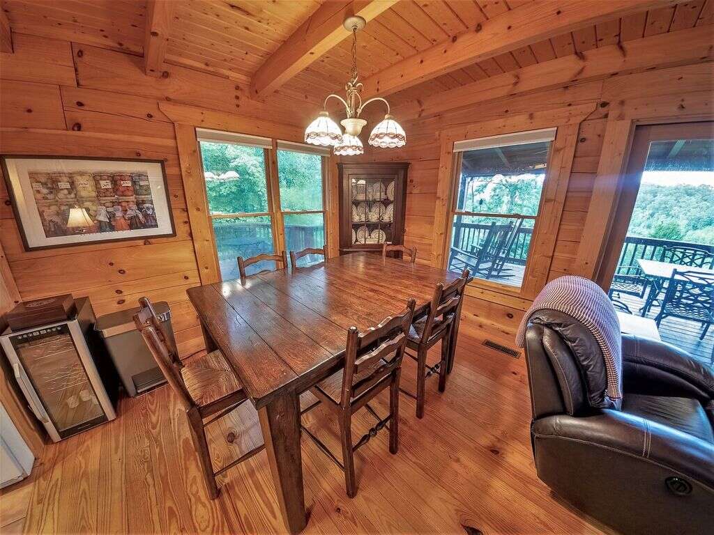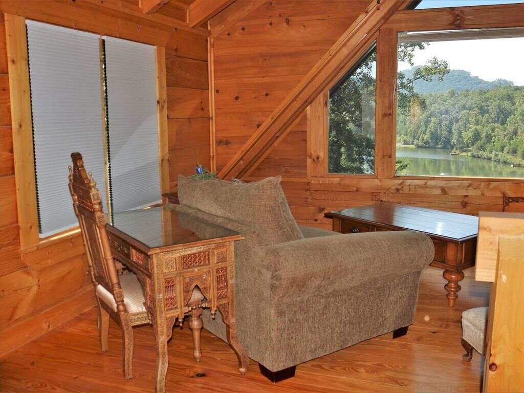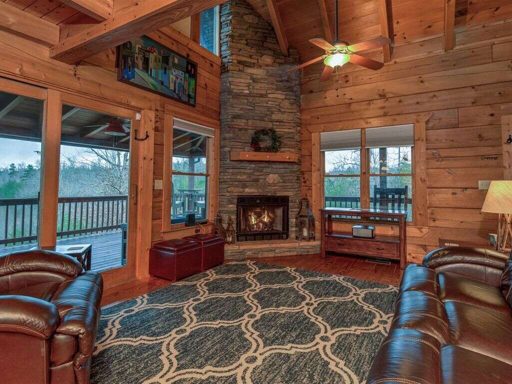 Honey Bee Hill is the perfect log cabin for a peaceful family retreat in the mountains. Sit by the outdoor gas-log fireplace and enjoy the serene lake view on the beautifully furnished wrap-around porch. Or, take the kayaks (included) out on the lake for a calming day on the private community’s 12-acre lake. End the day grilling out on the top-of-the-line CharBroil grill and watch the sky’s colors change as the sun dips over the horizon.
