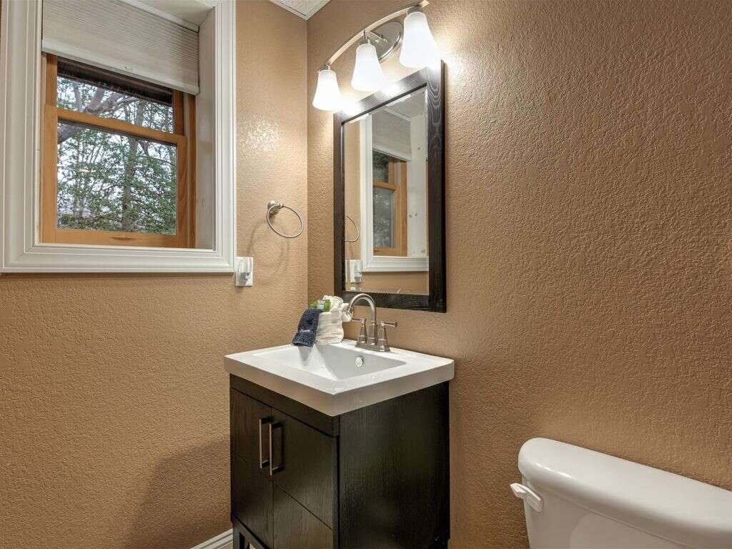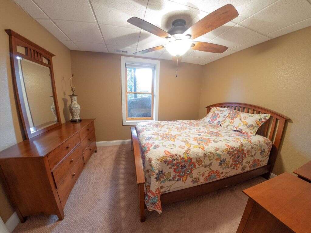 In the lower level, you'll find the home’s second living room, a television, an extensive book collection for your reading pleasure, and ample room for the kids. Also downstairs is the third bedroom with another queen bed and a full bathroom. The laundry facilities are also located on this level. Through the two sliding glass doors is a spacious patio, a bench swing, and a much sought-after, but rarely found, level and grassy area perfect for mingling, cartwheels, or yard games. Feel free to bring your own game of corn hole or bocce.