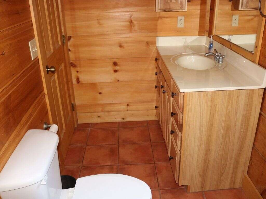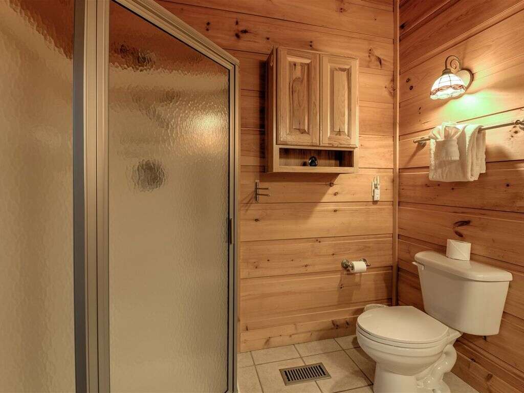 This two-and-a-half-story cozy log cabin boasts three bedrooms and three full baths to accommodate six adults. On the main level, you’ll find the dining room with a beautiful wood table that seats six, the living room with an electric leather recliner and sofa, a stonework gas-log fireplace, the kitchen with everything you’ll need, a bedroom with a queen bed, and a full bathroom with a tub for the kiddos.