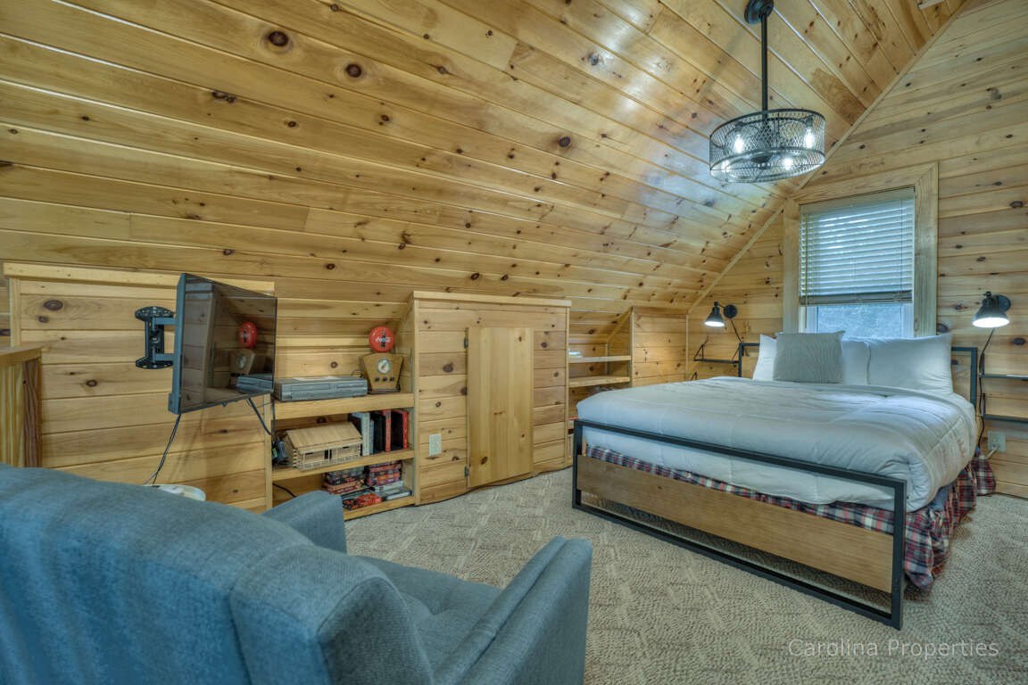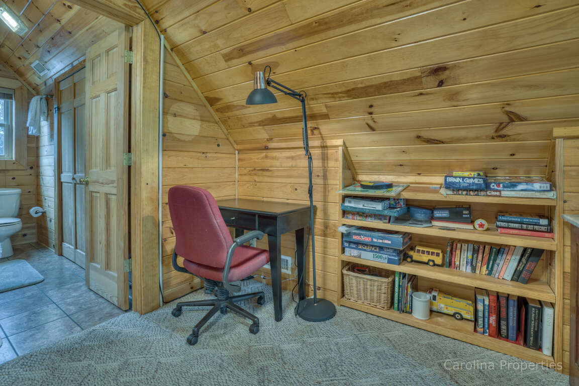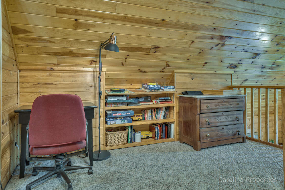 The upper level has a loft bedroom, spacious full bath, rocking chair, and desk space with a great view for relaxing, reading, or having morning coffee.