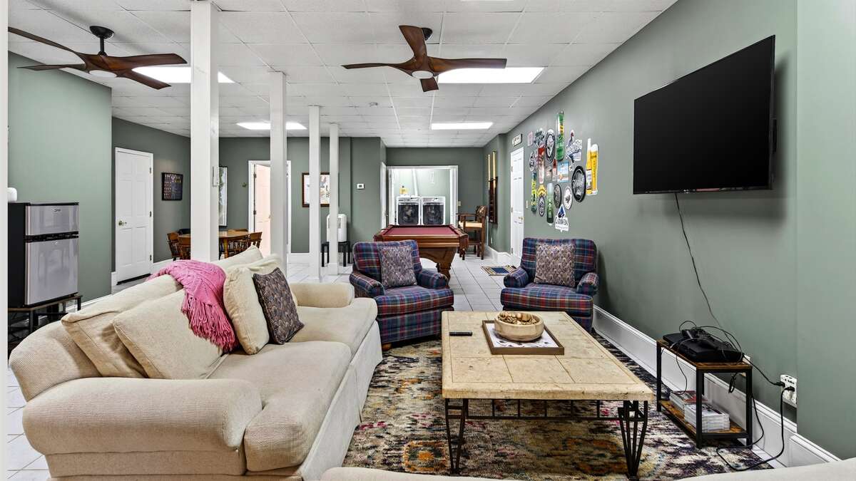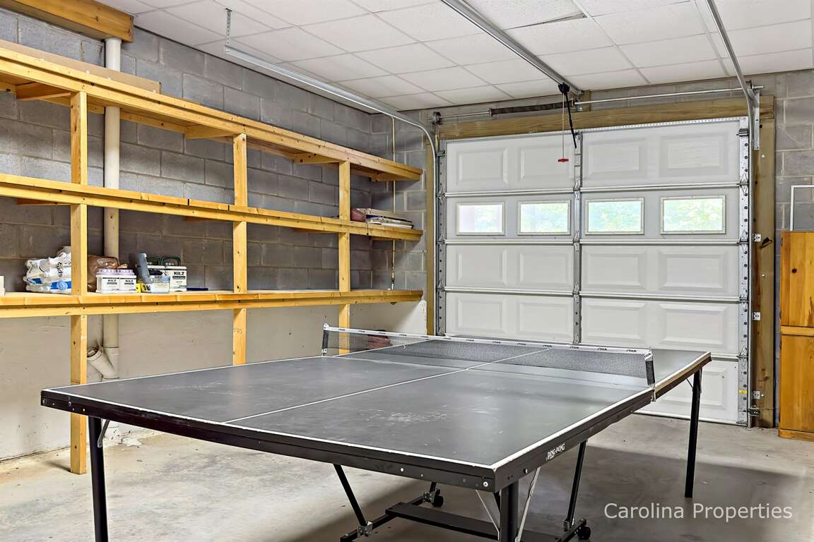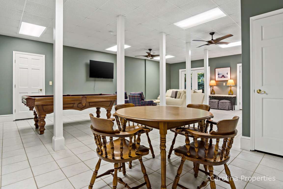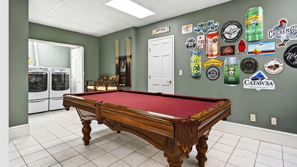 The lower level offers a large space for families or groups to gather to play pool, cards, or board games (Connect Four, chess/checkers/backgammon, Guess Who, Clue, and some others provided in the hutch off the kitchen by the front door). The space also includes the second dining area, third full bathroom, laundry, and access to the garages and driveway. Finally, in the closet under the stairs are several inner tubes/floats/boogie boards that guests can take to the pool.